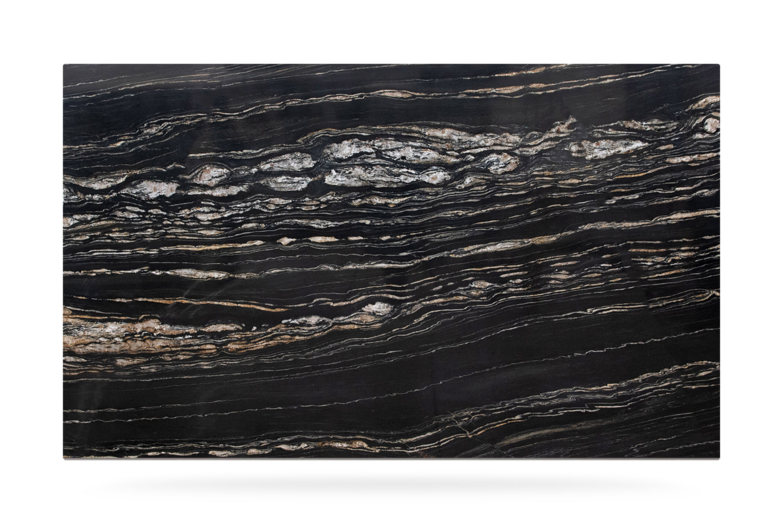 Fine-grained quartzite from South Africa. Its intense black background is enriched by irregular white-golden veins that cross the slabs, giving professionals in the sector the opportunity to create wonderful open-book compositions. This material is among the hardest and most resistant quartzites, used for the creation of wall coverings, internal floors but also external design projects and decorations.