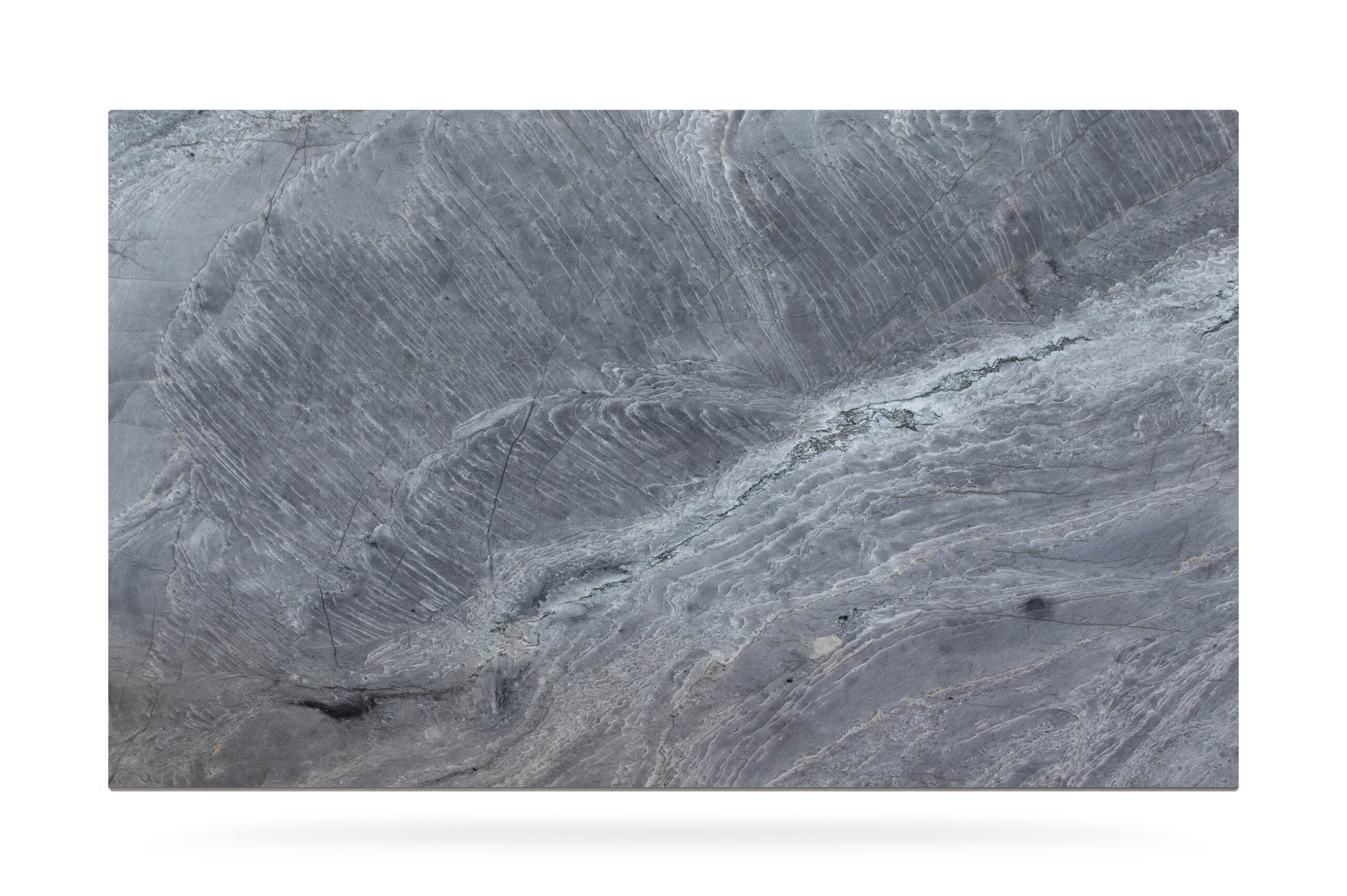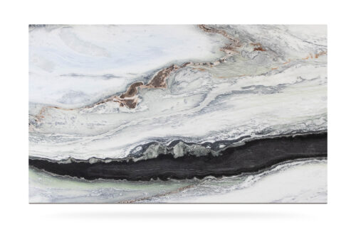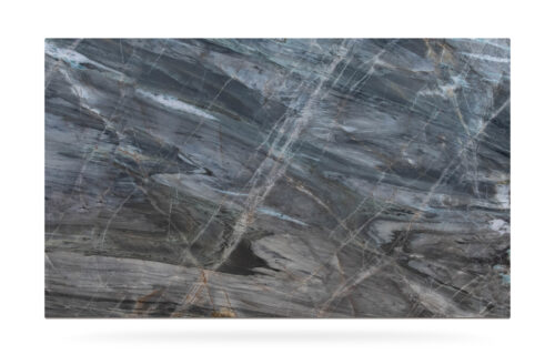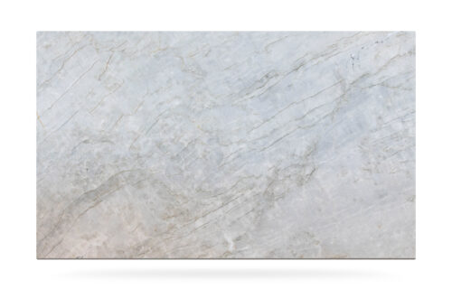 This quartzite, quarried in Brasil, has a light grey background with darker and golden veins, that enhance the beautiful movement of the pattern.
