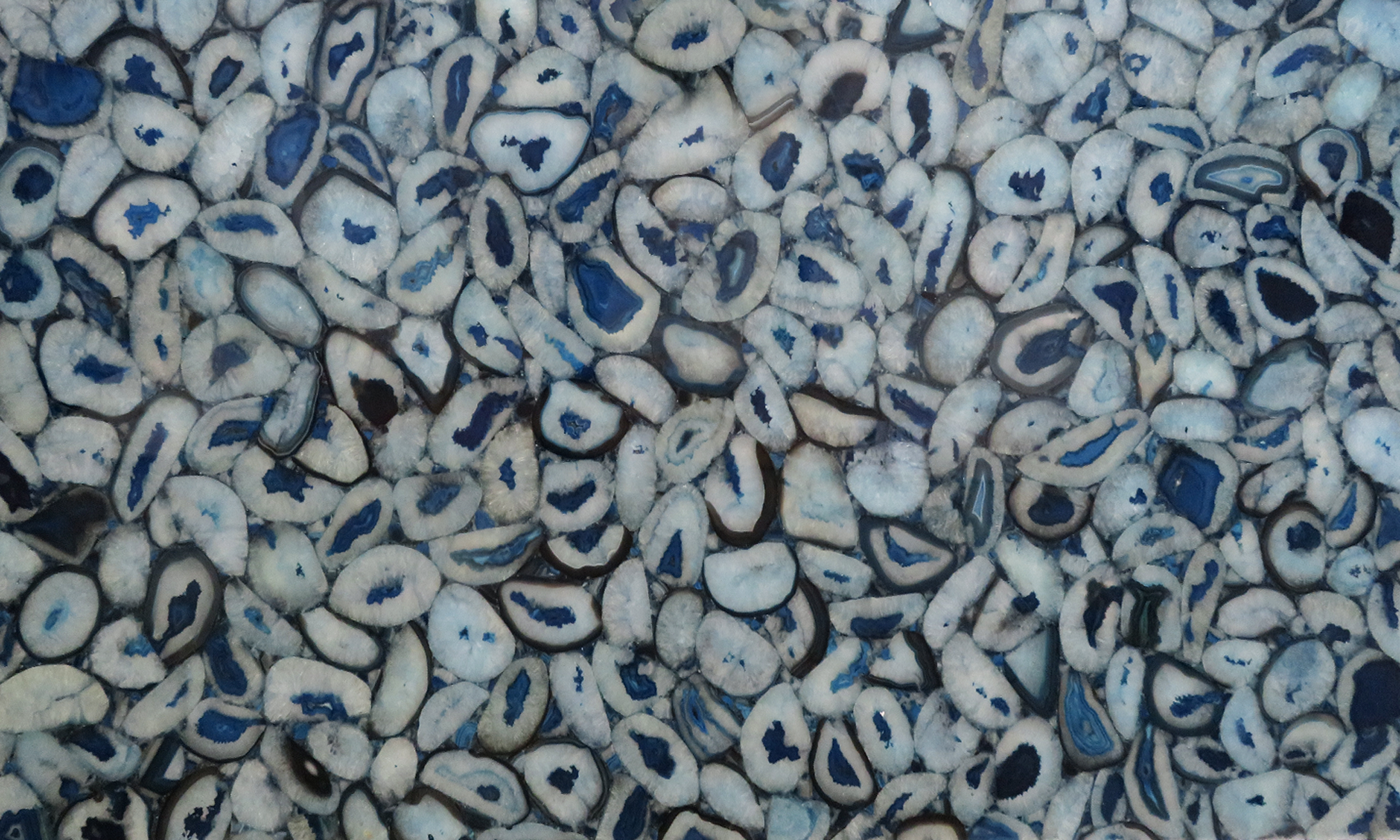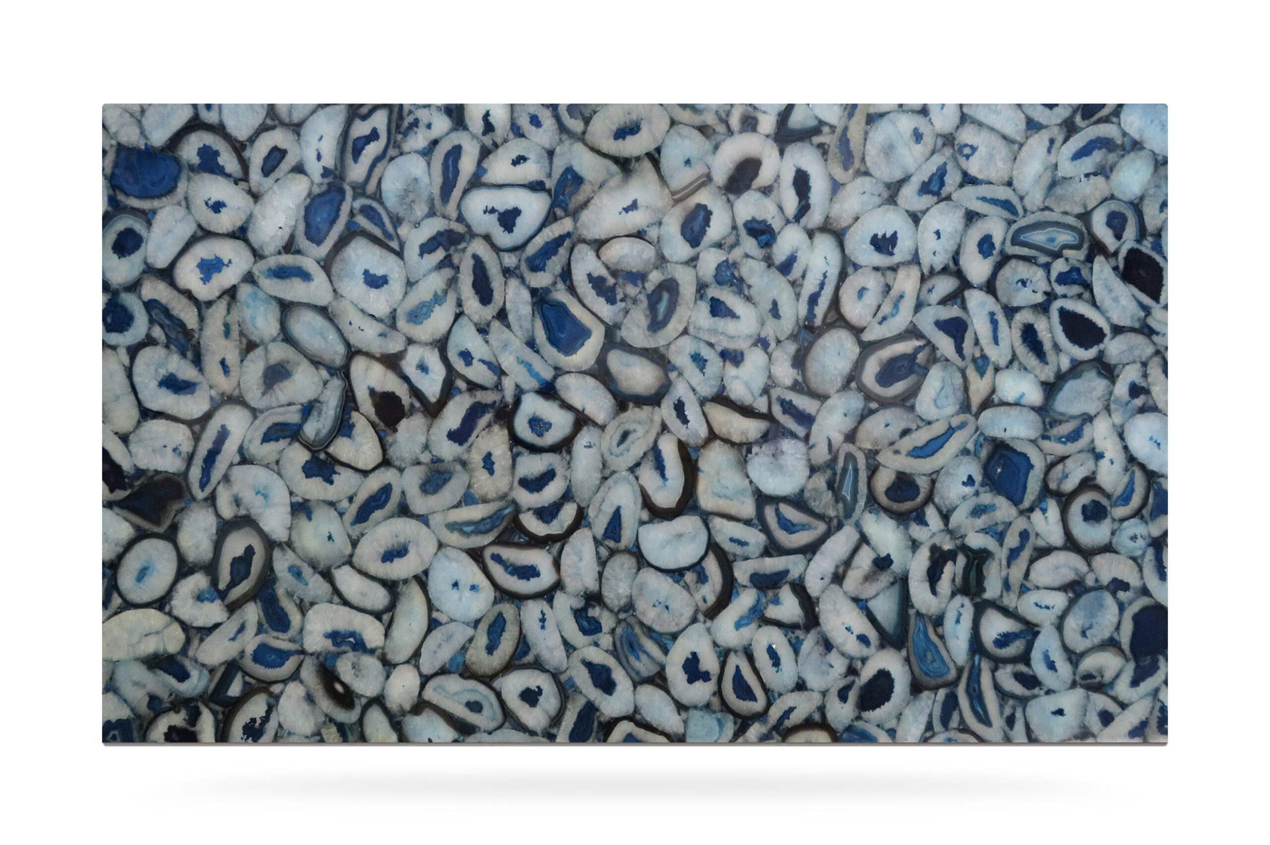 Beautiful semiprecious stone, the colour is intense blue with white and brown, transparent and brilliant. The quartz is processed and assembled with resin to create the slabs. The very stylish and elegant look of this semiprecious quartz is unique and ideal for ornaments and to produce jewels. Semiprecious stones are typically used for indoor and high-level decorations.