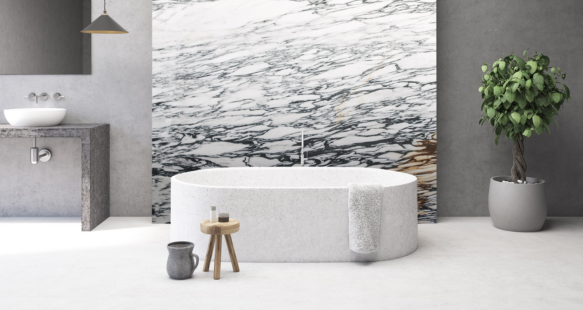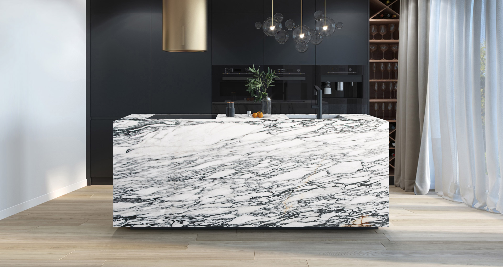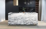 Italian marble from Monte Corchia. The white background is crossed by branches of grey-blue veins which create irregular ovules of different sizes and give the slab the appearance of an arabesque. This elegant stone with a long tradition is particularly hard and naturally capable of resisting abrasion and temperature changes. It is used in internal creations such as floors and wall coverings, and outdoor environments such as paths and porches.