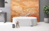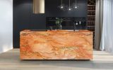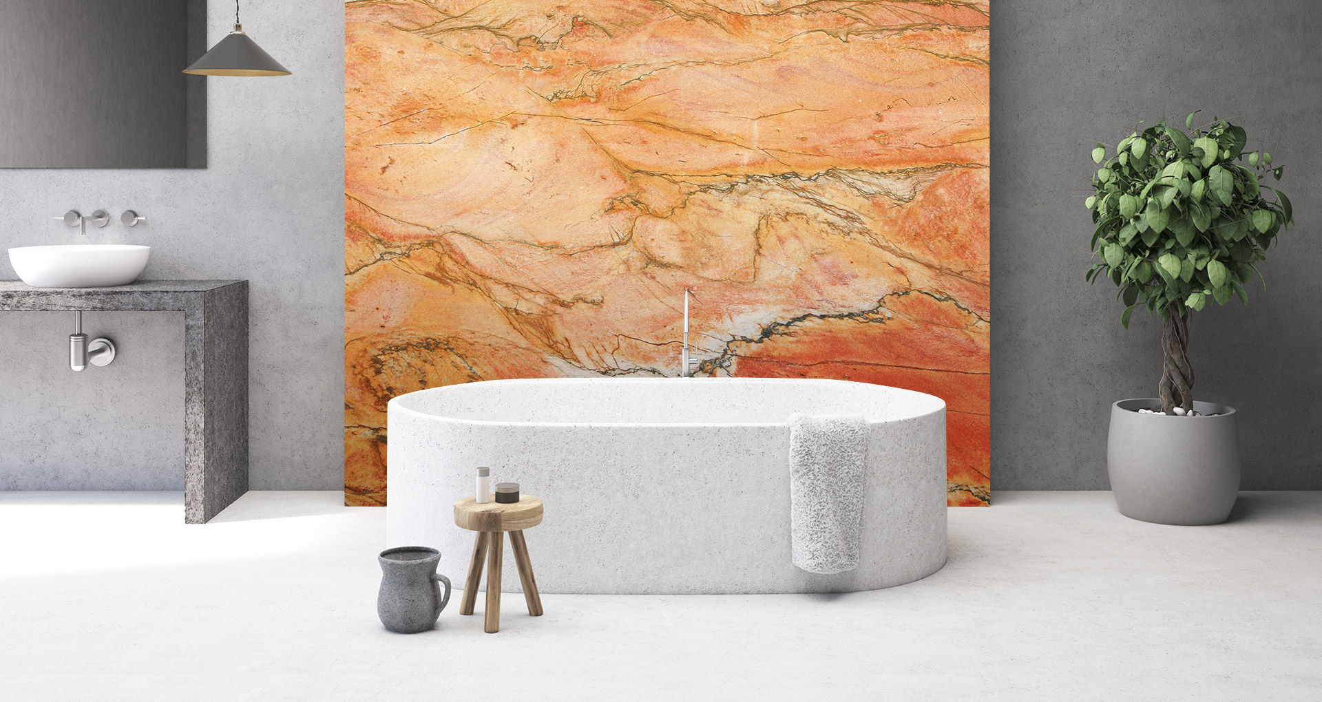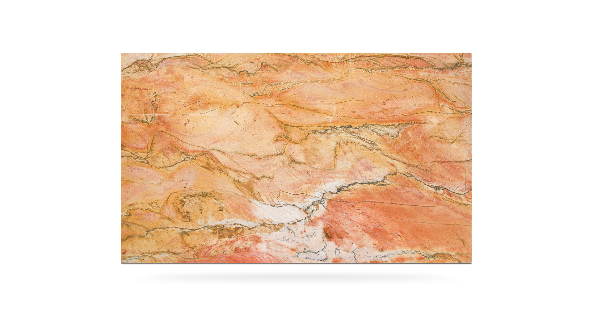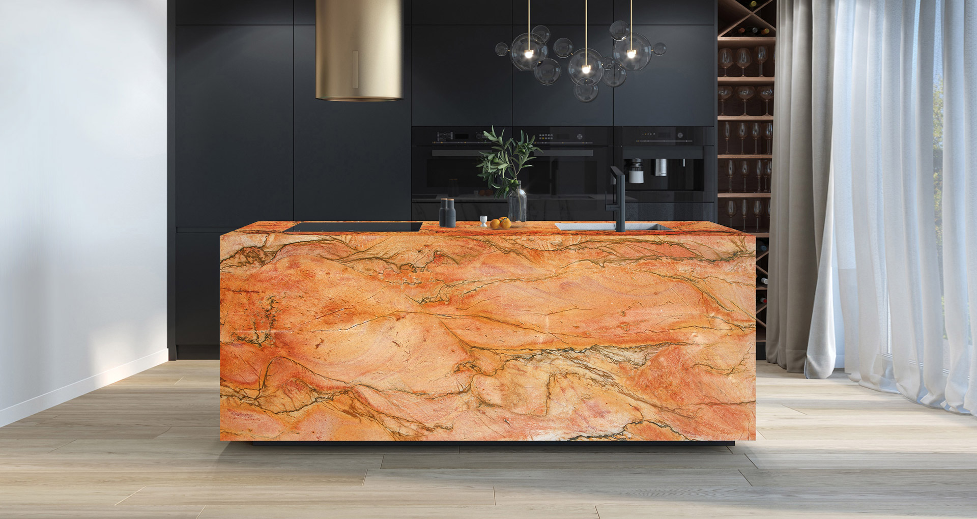 Majestic Brazilian quartzite characterized by very bright shades of orange, white and red; allows you to create elegant but impactful furnishings, both indoors and outdoors.