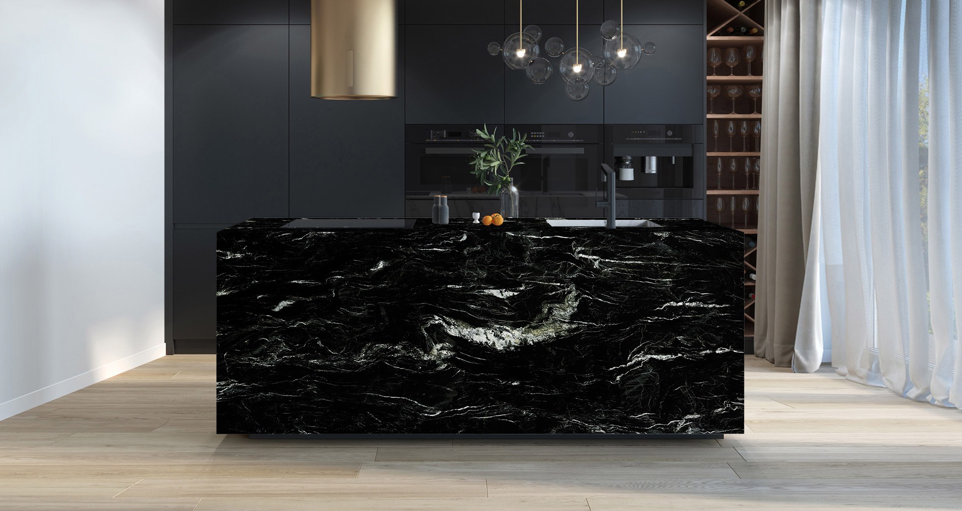 Fine-grained quartzite with a deep black background, crossed by white and gold veins that create a natural contrast with a strong impact. Coming from South Africa, this black quartzite is considered one of the hardest and most resistant materials, with a low degree of absorption of liquids and fats. Belvedere is an ideal material for the creation of floors, kitchen tops and wall coverings.