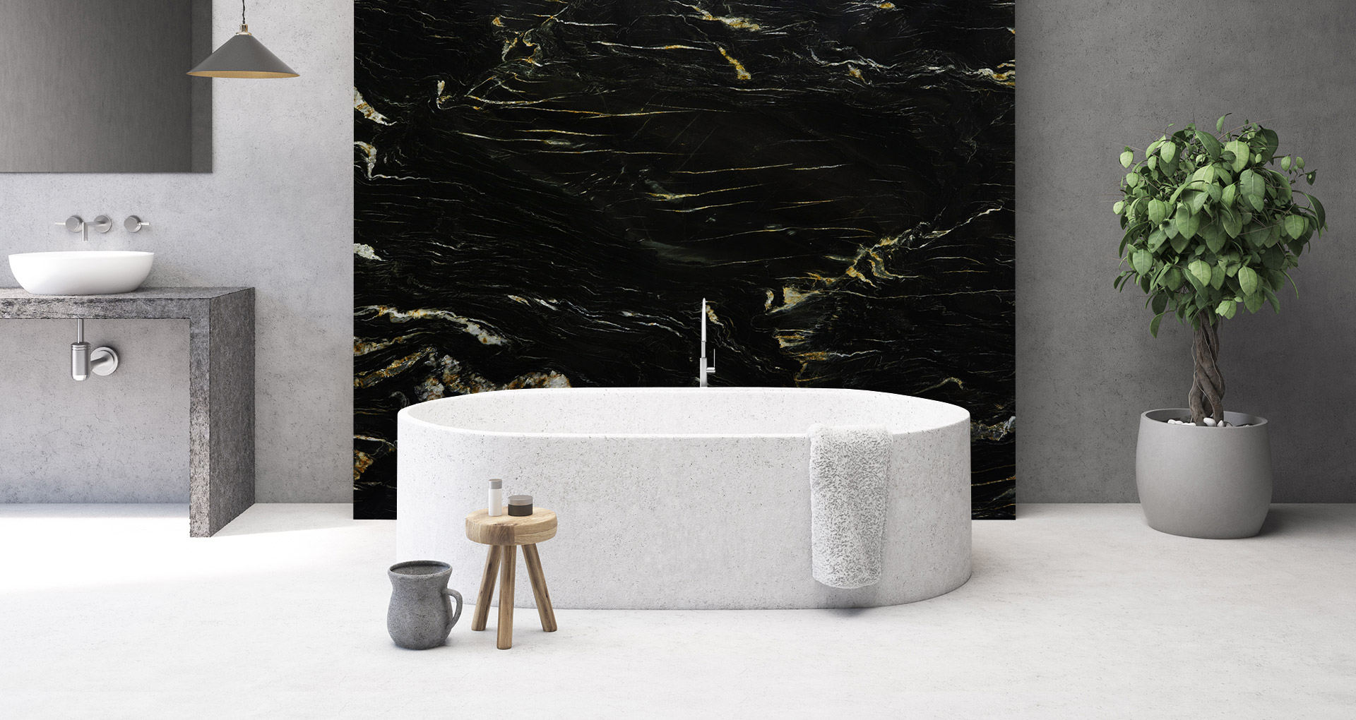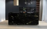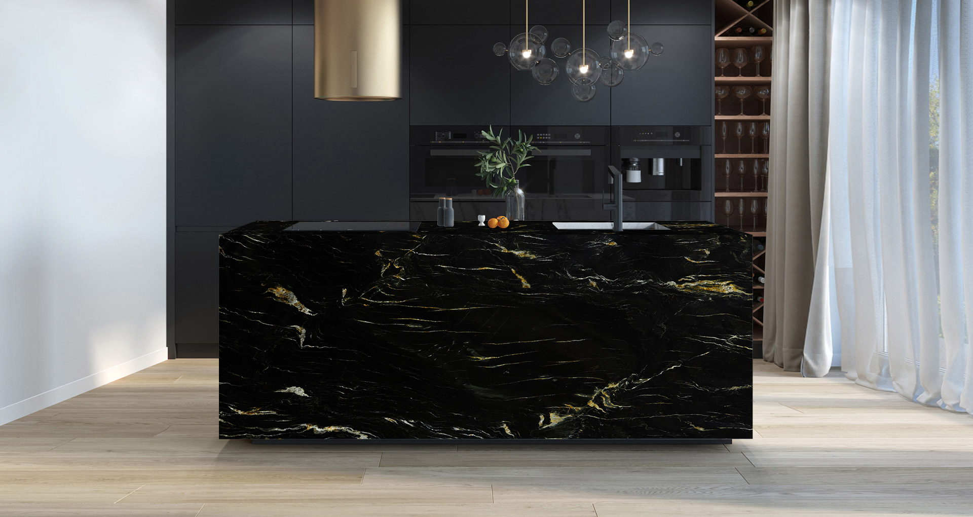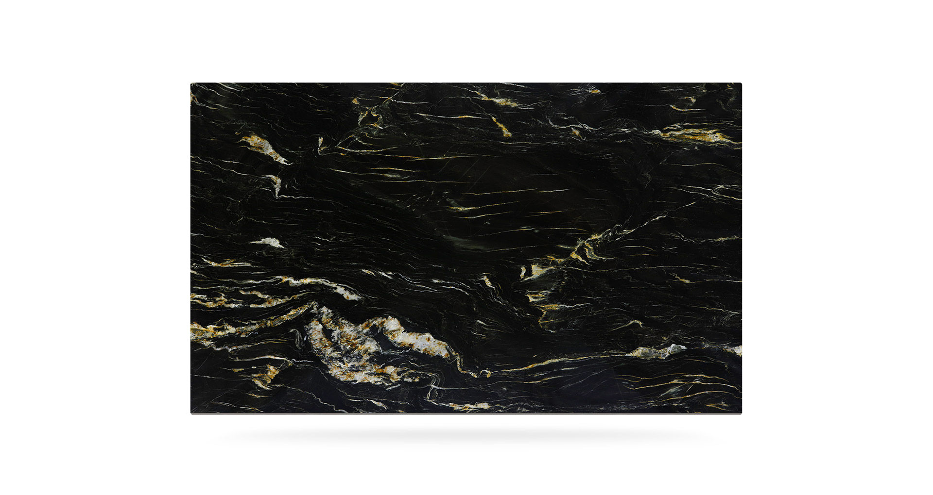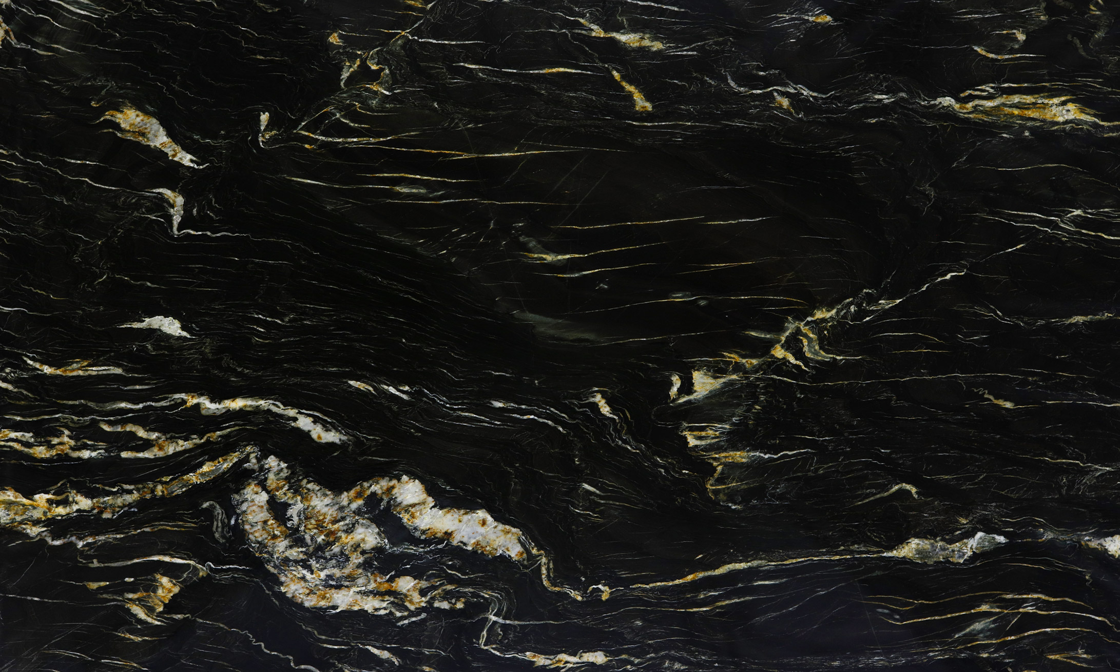 Fine-grained quartzite with a deep black background, crossed by white and gold veins that create a natural contrast with a strong impact. Coming from South Africa, this black quartzite is considered one of the hardest and most resistant materials, with a low degree of absorption of liquids and fats. Belvedere is an ideal material for the creation of floors, kitchen tops and wall coverings.