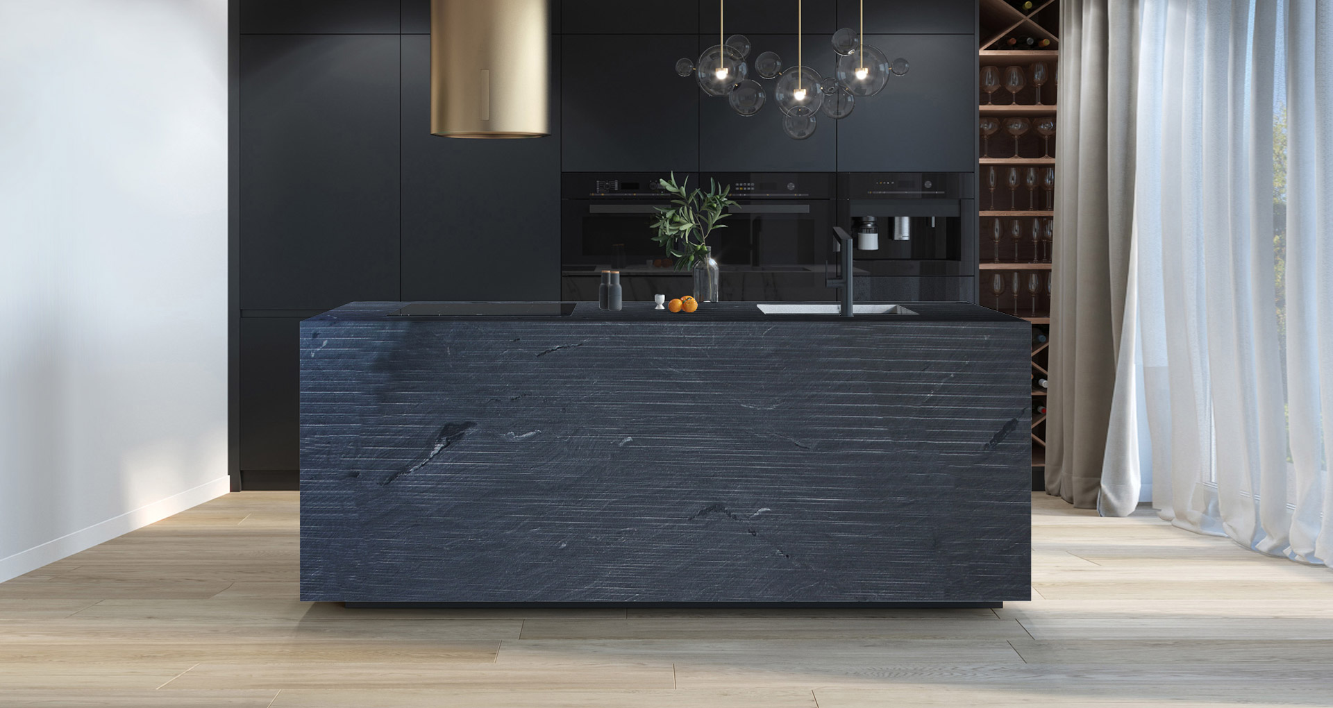 Elegant Brazilian quartzite. From the black background with very light shades of gray. Its hardness and uniqueness make it ideal for any type of use.