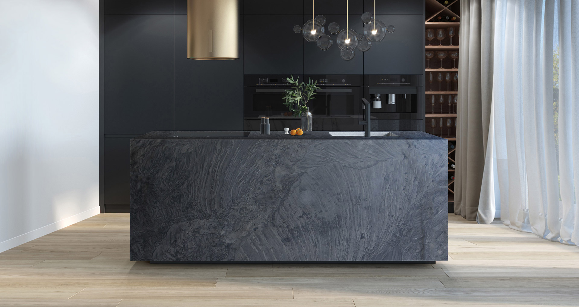 Quartzite from Brazil with dark tones: shades of blue and gray are the protagonists of this natural stone with a mysterious charm, which alternates with fine and surprising veins that give depth to the slabs. Resistant to heat and wear, New Adamantium is a sought-after material for the creation of environments that want to guarantee elegance and uniqueness. Ideal for floors, wall coverings, kitchen countertops and decorative accents.