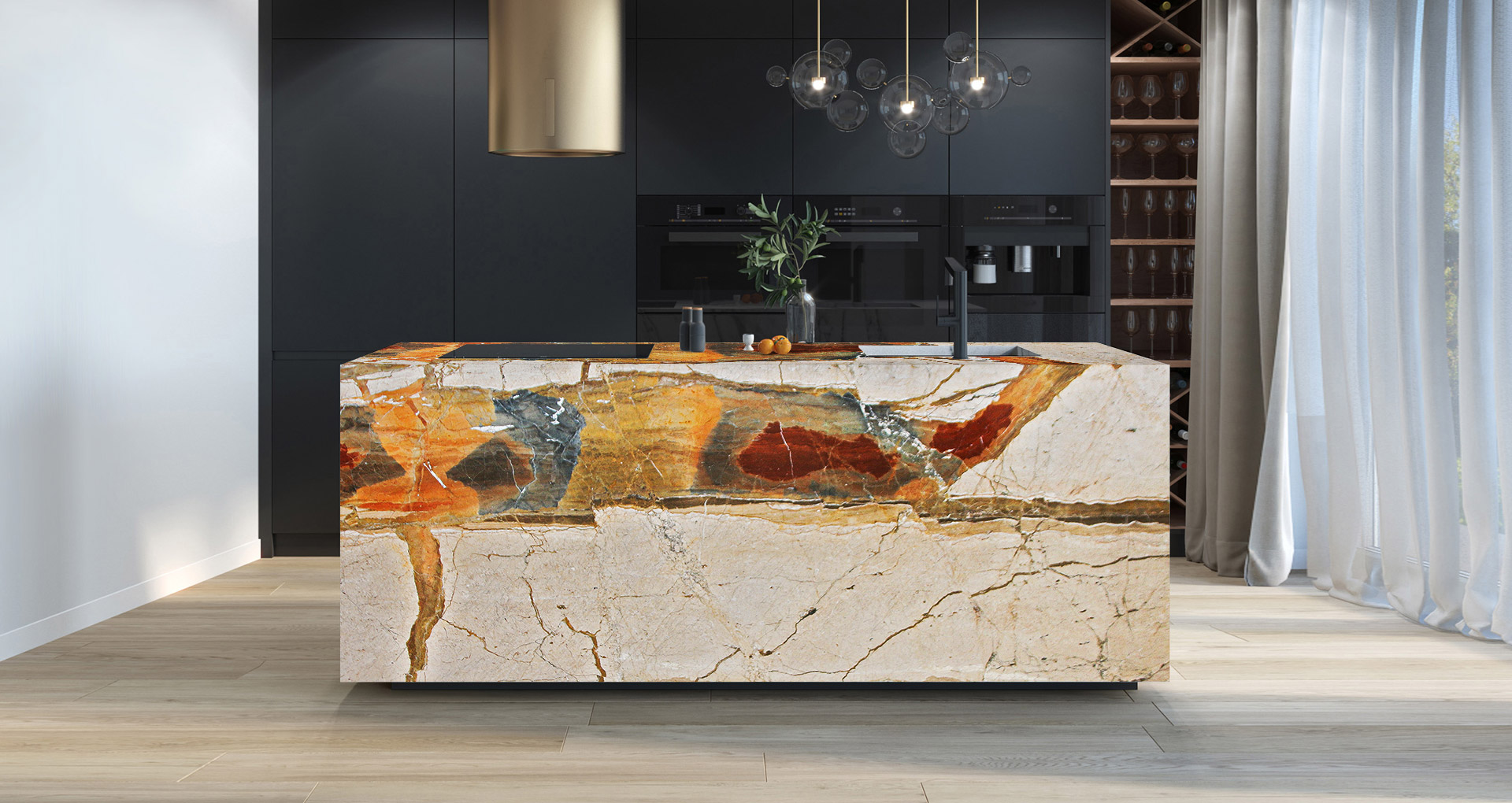 Marble extracted in Europe with warm and enveloping tones: the white/pink background is crossed by infinite red, yellow and green veins, with their relative shades. The hardness and compactness of the marble are an added value for this natural stone, excellent for furnishing both internal and external environments. Floors, open-matched wall coverings and kitchen tops are just some of the possible creations with Breccia Elegante.