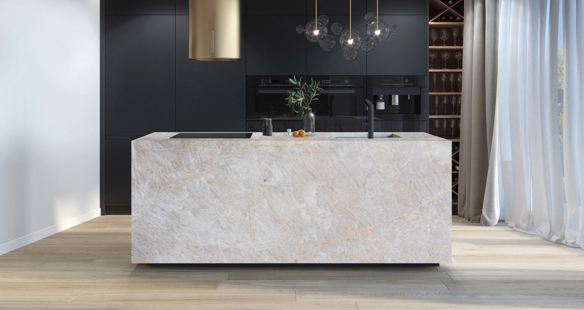 Very elegant Brazilian quartzite with a pearly white color and crossed by light brown quartz veins. Its transparency allows you to create backlit visual effects capable of animating interior design environments. Despite what you might think, the significant presence of quartz in its composition makes this material particularly resistant to pressure and corrosive agents.
