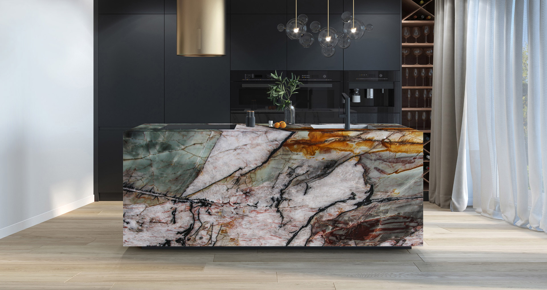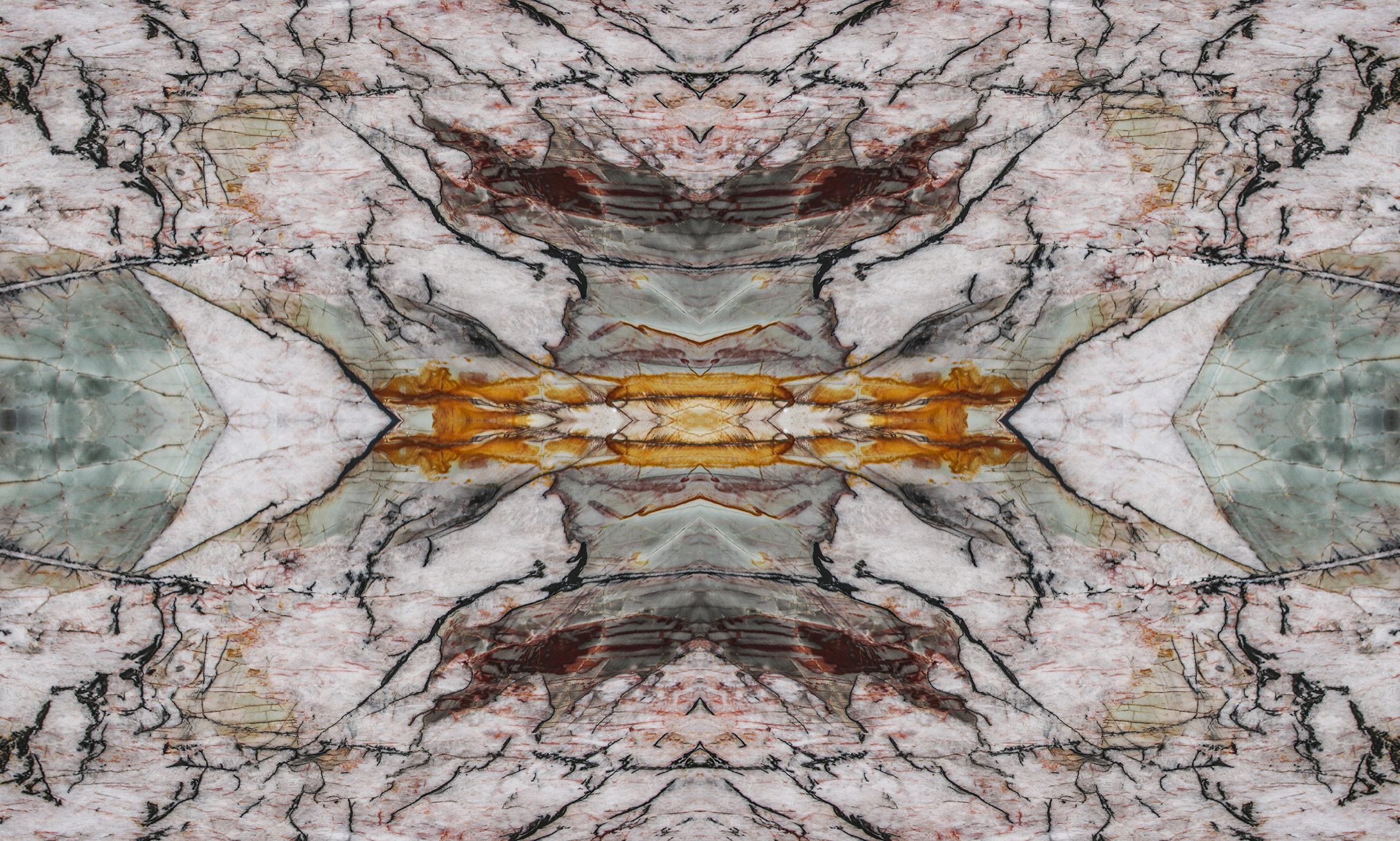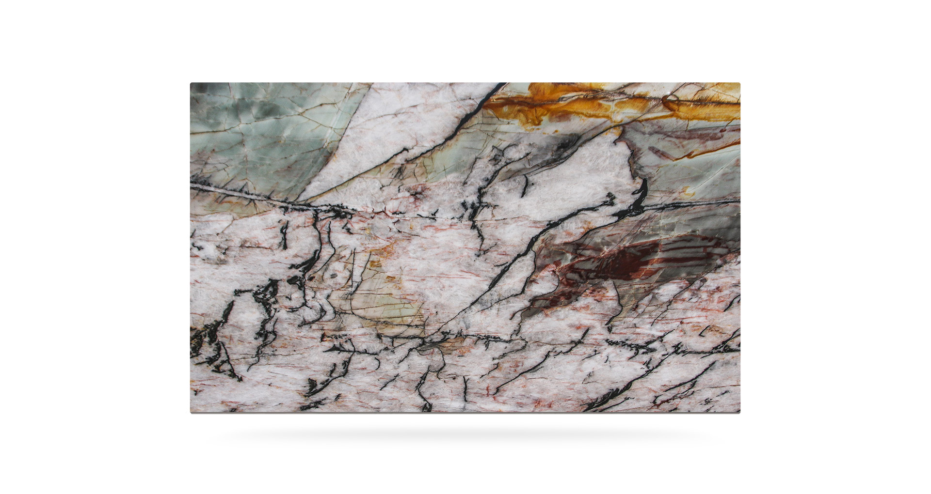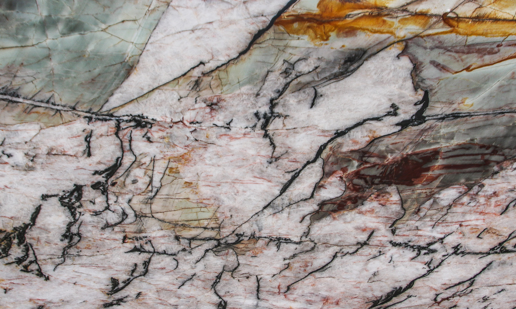 Quartzite extracted in Brazil whose colors generate a pleasant contrast. The crystalline white background is crossed by irregular black veins and by green, pink and sometimes yellow spots and shades. Of medium hardness, it is a versatile material. Excellent for coverings and decorations, it is recommended in a polished finish.