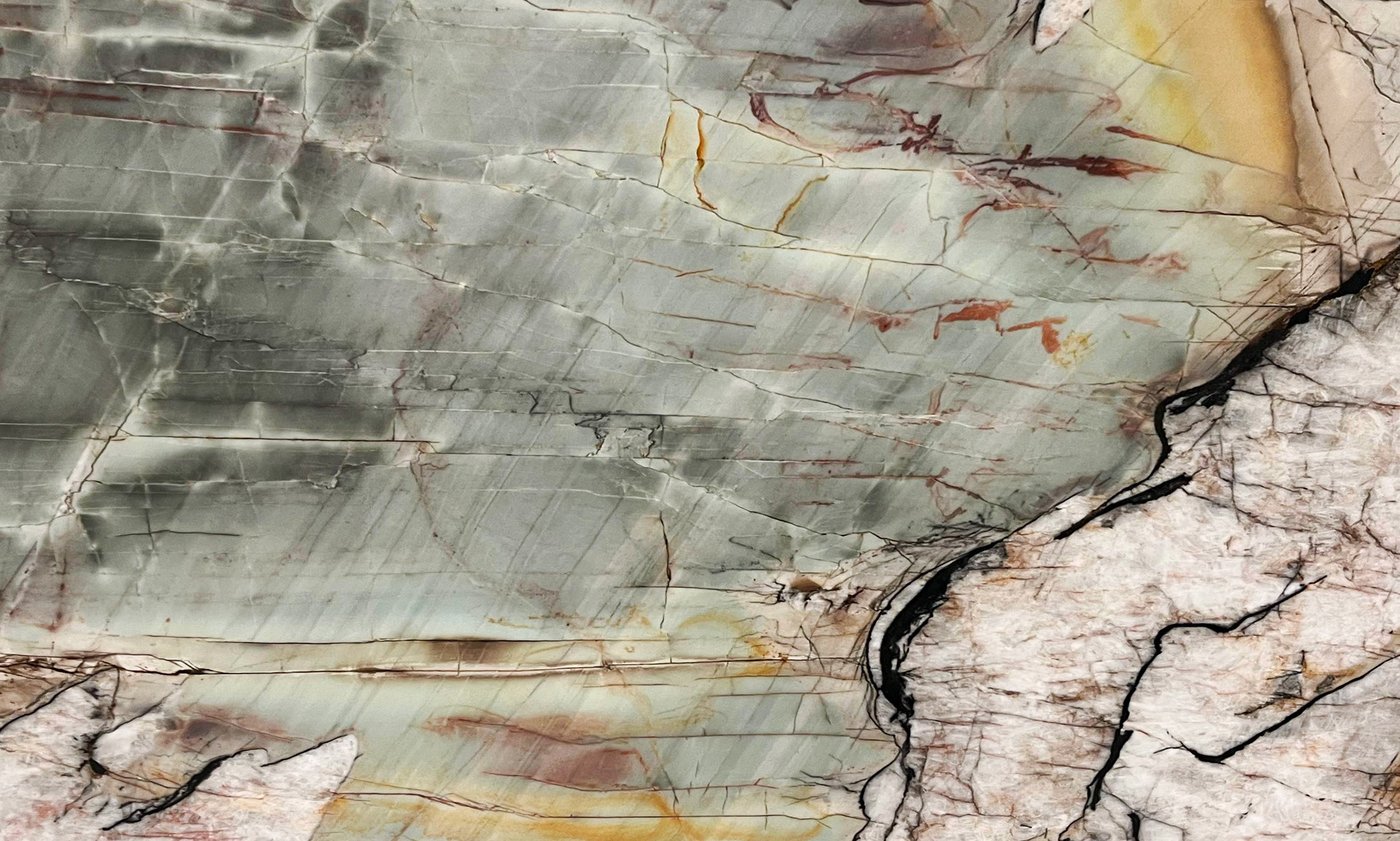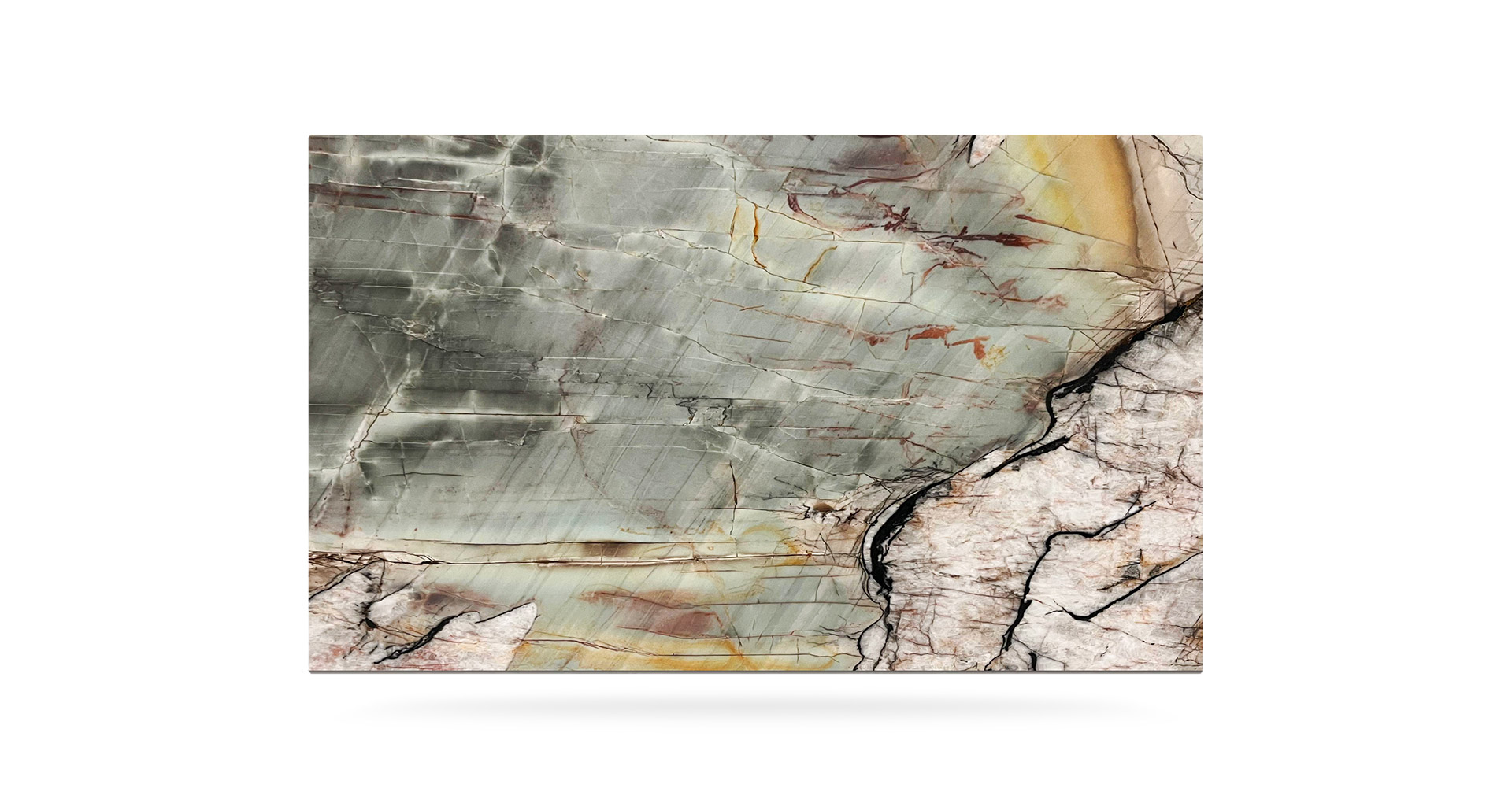 Quartzite extracted in Brazil whose colors generate a pleasant contrast. The crystalline white background is crossed by irregular black veins and by green, pink and sometimes yellow spots and shades. Of medium hardness, it is a versatile material. Excellent for coverings and decorations, it is recommended in a polished finish.