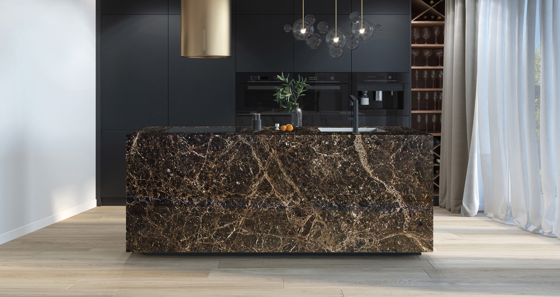 Marble from southern Spain, mainly extracted between Murcia and Alicante. This material is able to take on different shades depending on the quantity of calcite present, which is why the main colour, brown, can be seen in its many tones. A network of hazelnut-coloured and golden-tinged veins embellishes the slabs, giving uniqueness to each creation. Its contemporary style and its robustness make this marble a first choice for designers who intend to furnish interior and exterior environments with personality.