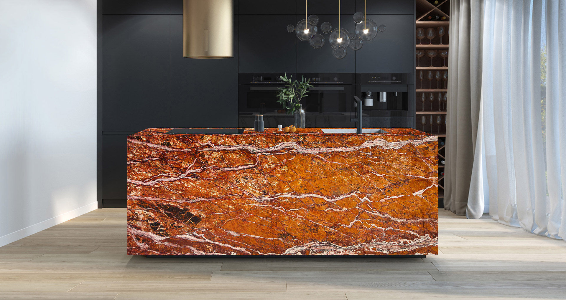 African marble characterized by an intense orange background and gray veins. Medusa makes your interior spaces unique and inimitable.