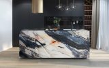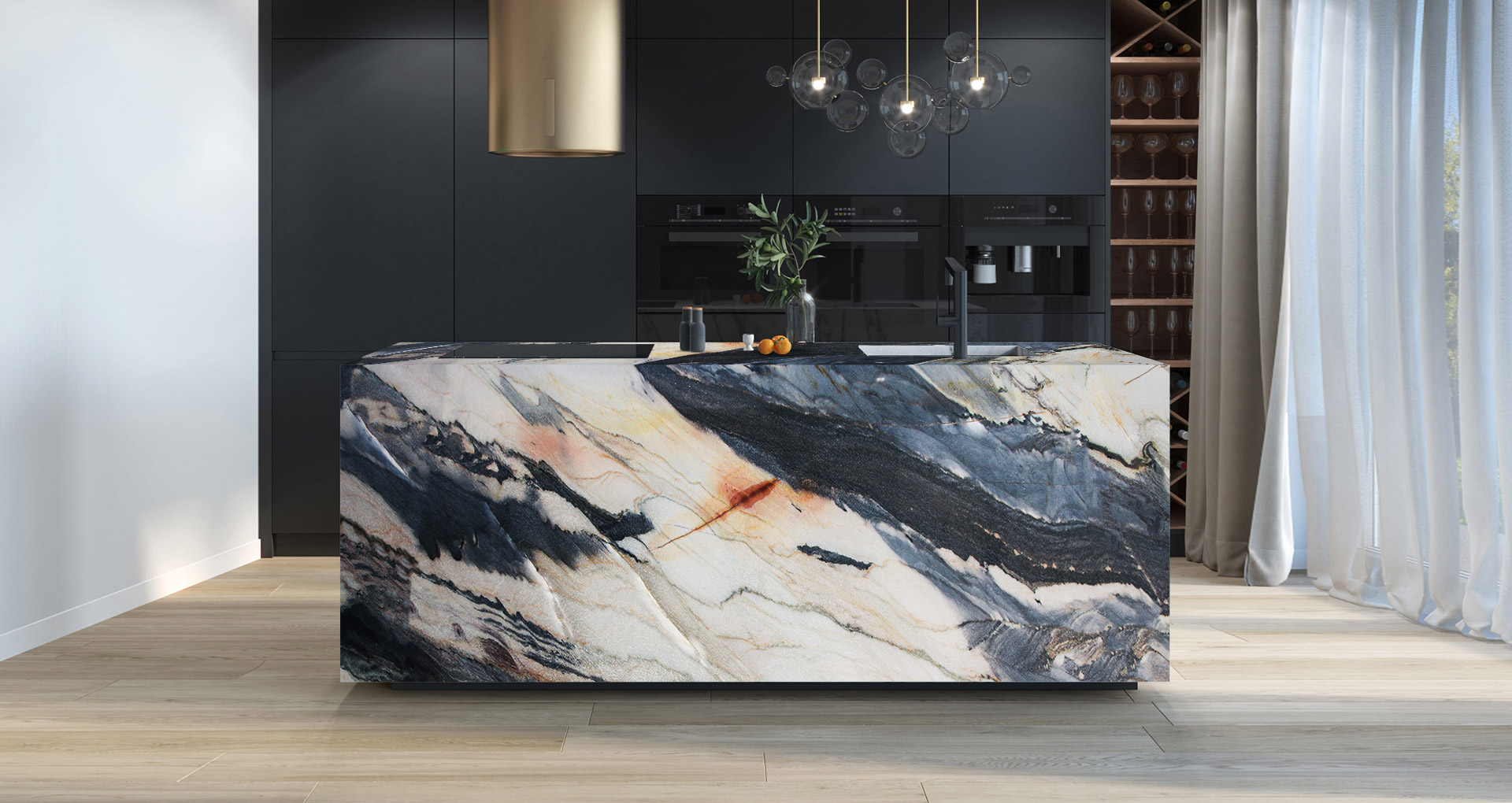 Brazilian quartzite with rigid tones that recall the movement of the waves: the blue background is crossed by irregular white veins of medium size. Ocean Fantasy guarantees a deep impact and brightness to any creation, for this reason it is recommended for use in elegant, large and bright environments. The strength of the material also allows its use in outdoor environments.