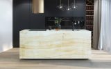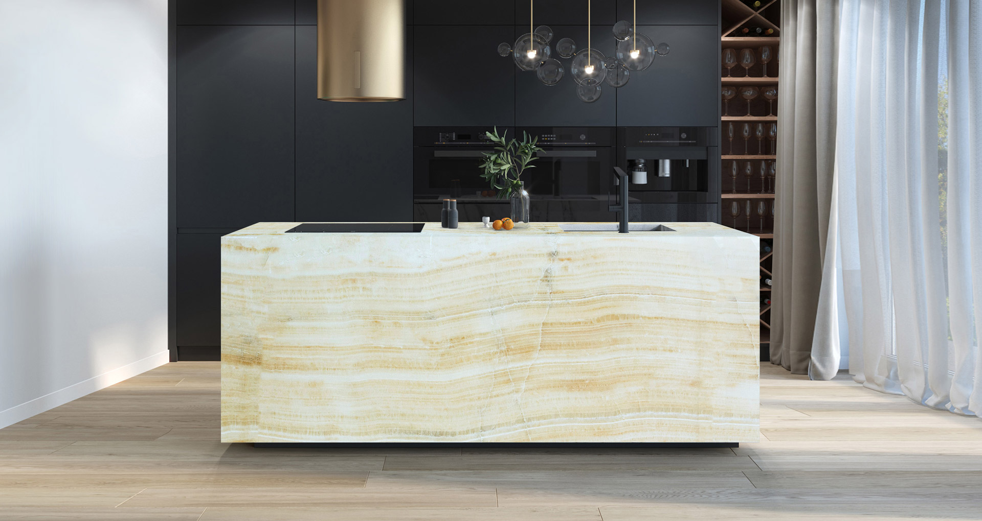 Onyx from the ancient Persia quarries. Characterized by a veining structure with colours ranging from brown to beige, that create a very unique and refined look. It has a uniform texture, easily backlit, and perfect for elegant environments. Can be used for flooring, claddings, internal stairs, tables, kitchen and bathroom tops. Particularly beautiful when polished, can also be honed or brushed.