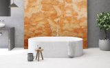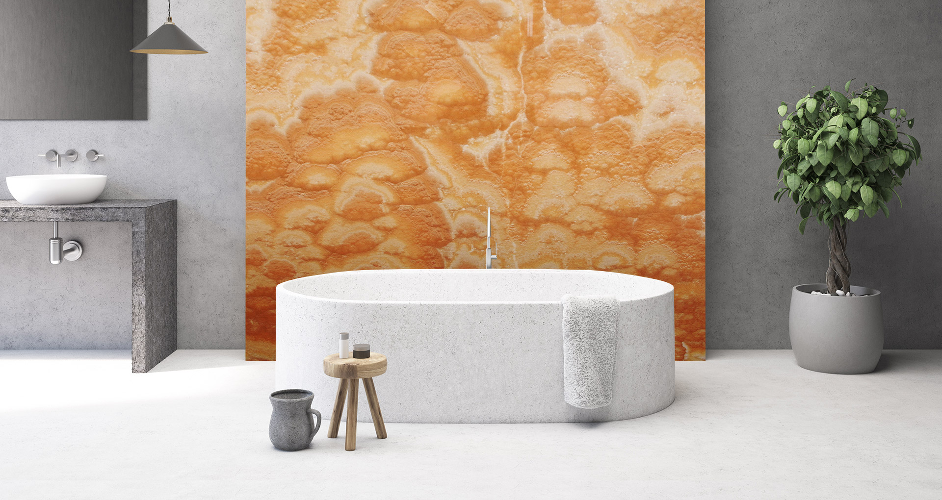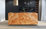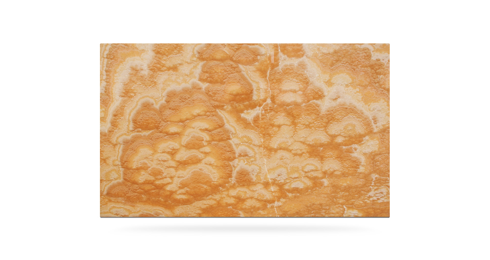 Onyx with a bright and cloudy orange background, embellished with lighter shades and white veins. Of medium compactness, it is able to resist impacts and temperature changes. Its use in the construction sector occurs mainly in interior environments: wall coverings, floors and ornaments are just some of the solutions that make onyx mango a valuable, current and sought-after material.