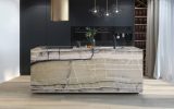 Precious onyx from Iran with soft colors: the light green combines harmoniously with the black, white and sometimes yellowish veins that cross the slabs horizontally. Particularly crystalline, thanks to its wide chromatic variety and its compactness it is used by specialists in the sector to furnish interior design environments with refined elegance.