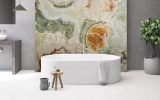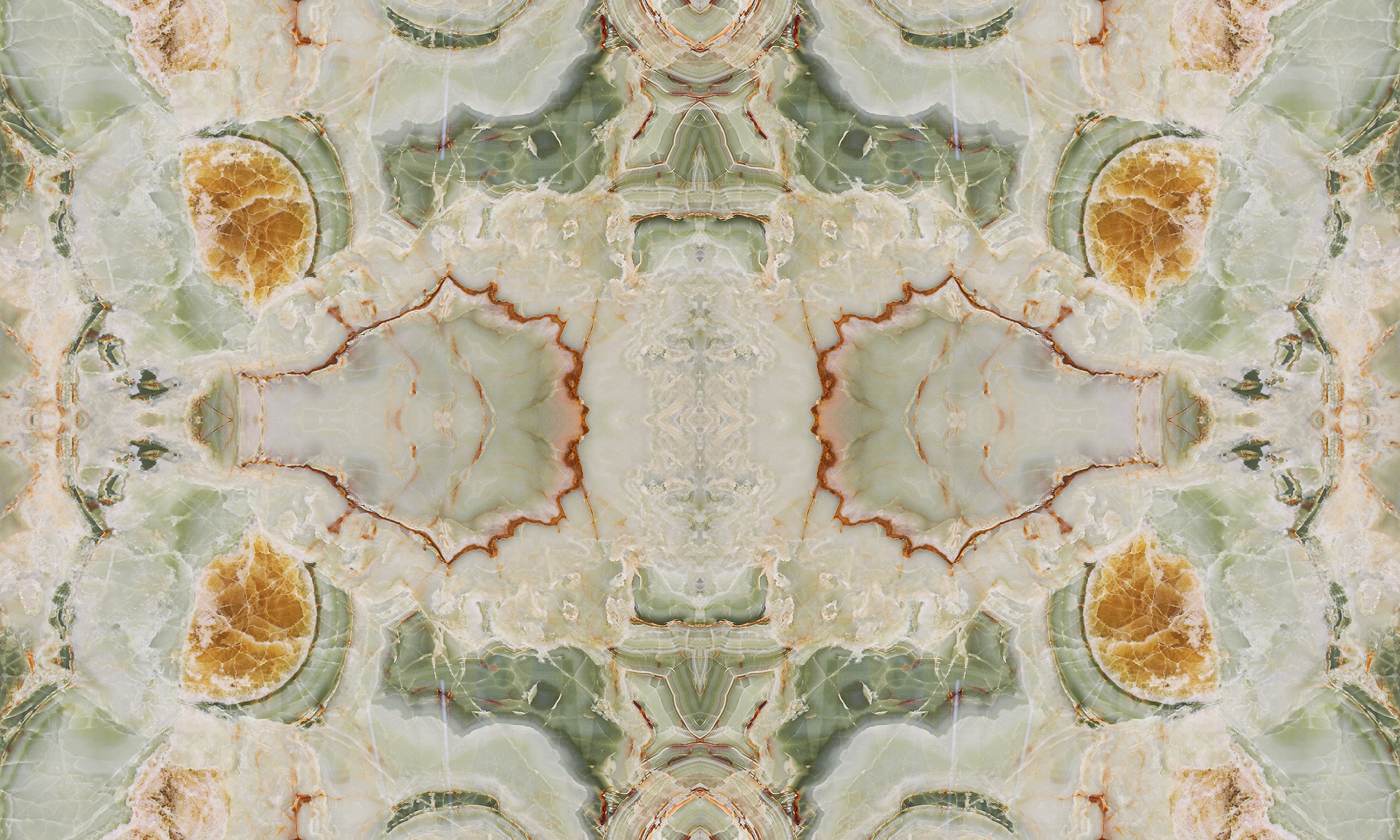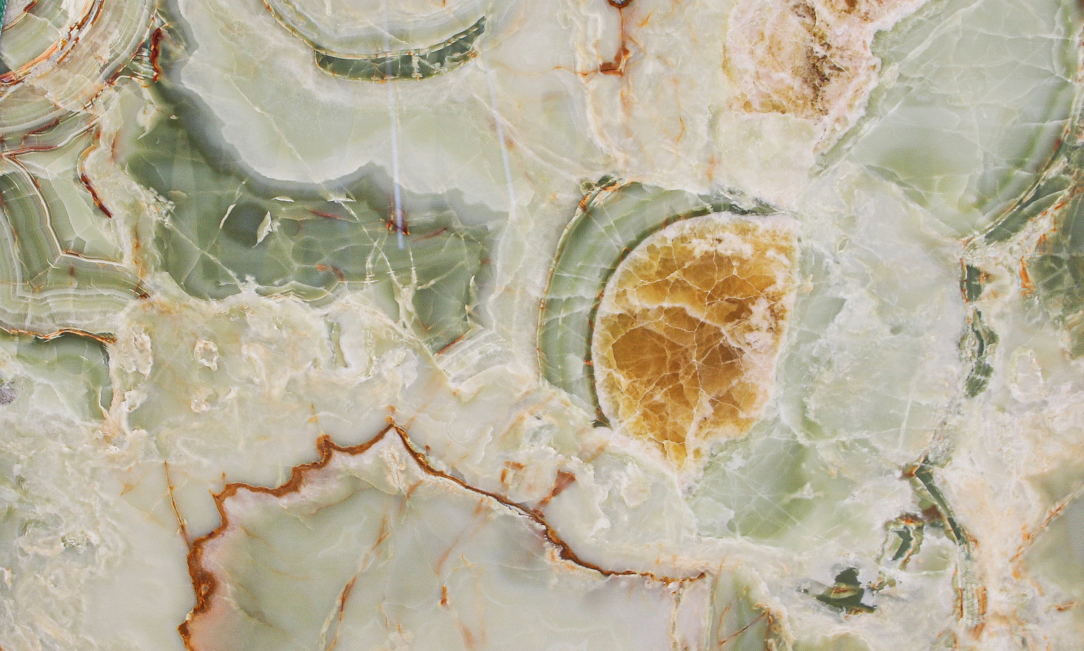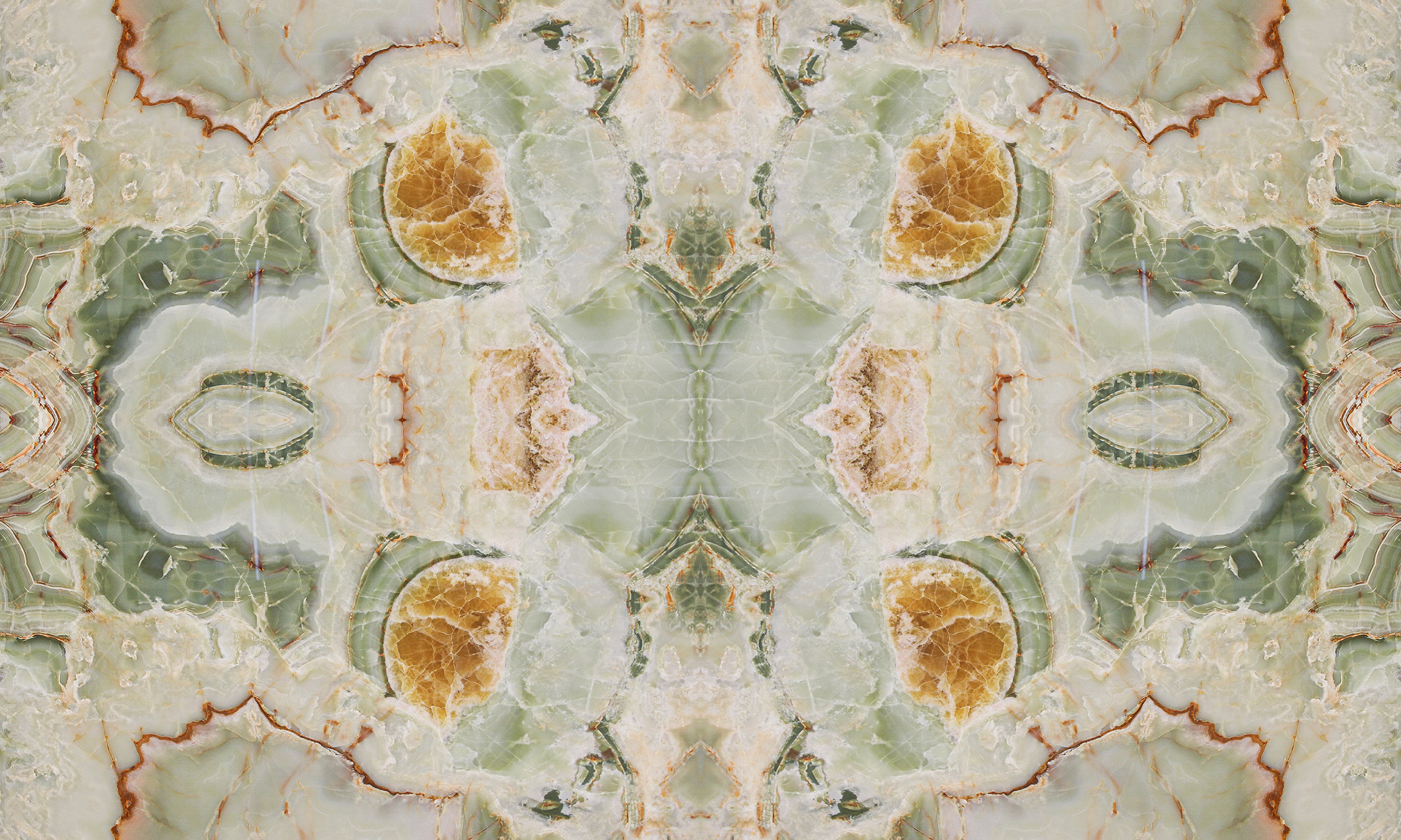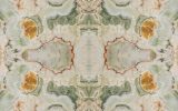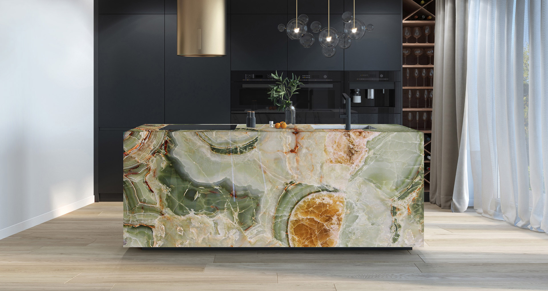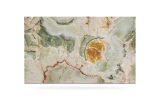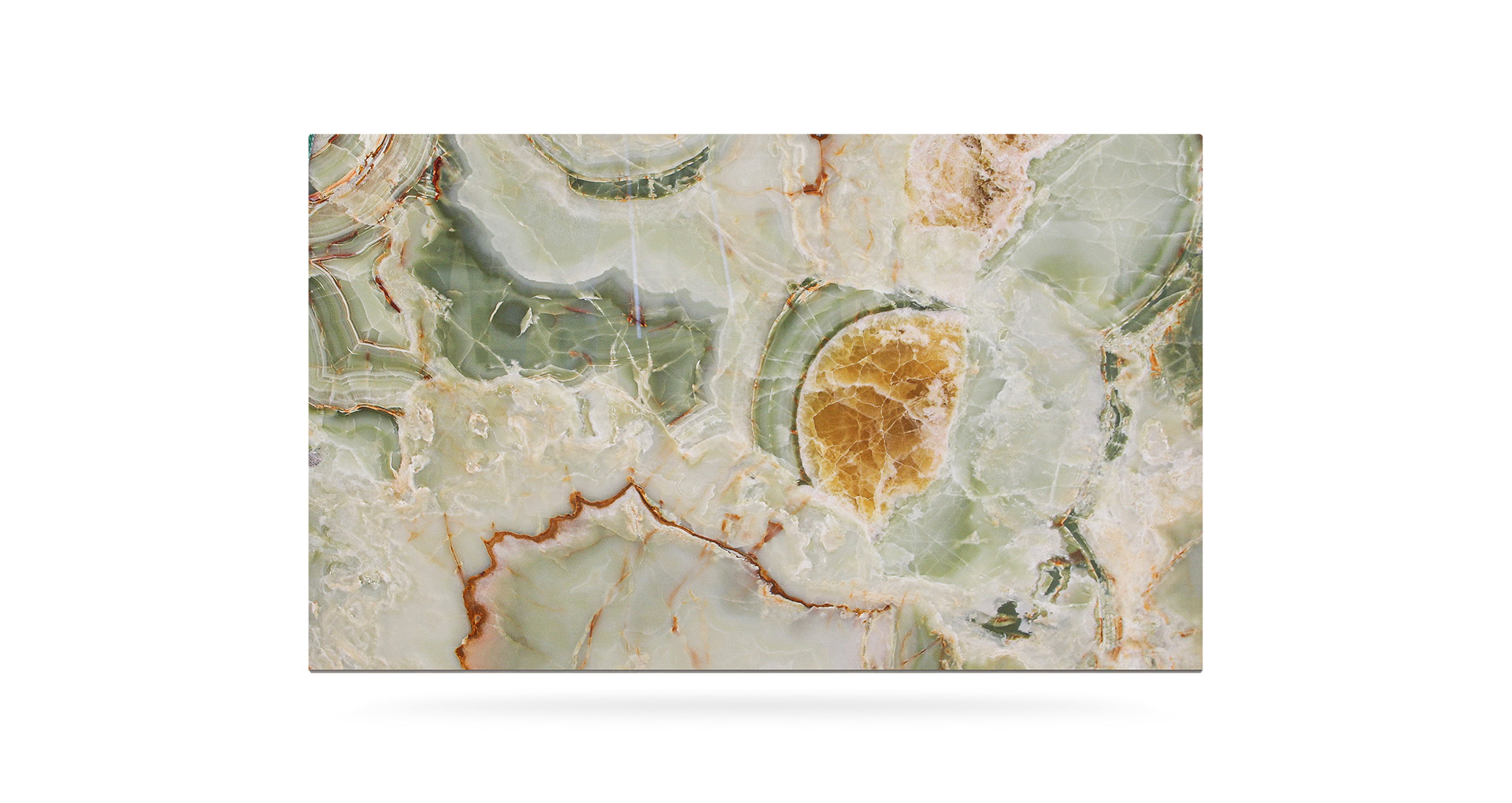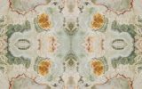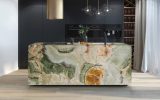 Very precious green onyx from the Middle East. The various shades, always on the green graduation, make each creation different from the previous one. Its cloudy shape is sometimes interrupted by thin orange veins which represent a distinctive characteristic of this material. Since Green Onice is a naturally delicate material, it is recommended for use in internal environments and with a glossy finish.