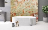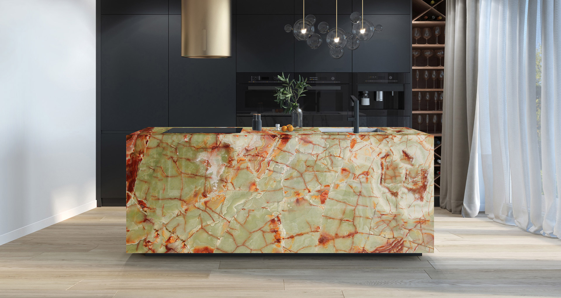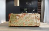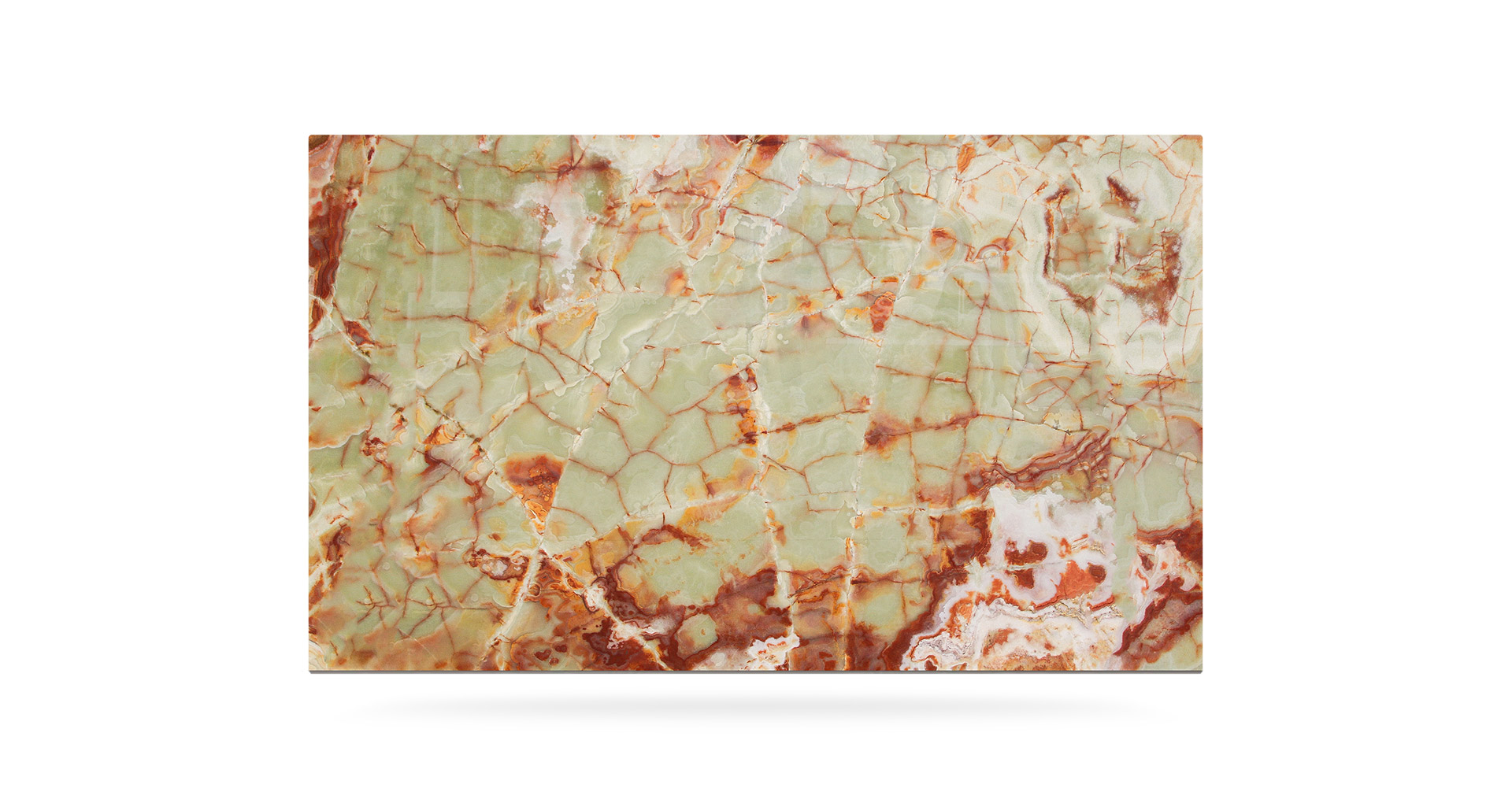 Very precious green onyx from the Middle East. The various shades, always on the green graduation, make each creation different from the previous one. Its cloudy shape is sometimes interrupted by thin orange veins which represent a distinctive characteristic of this material. Since Green Onice is a naturally delicate material, it is recommended for use in internal environments and with a glossy finish.