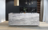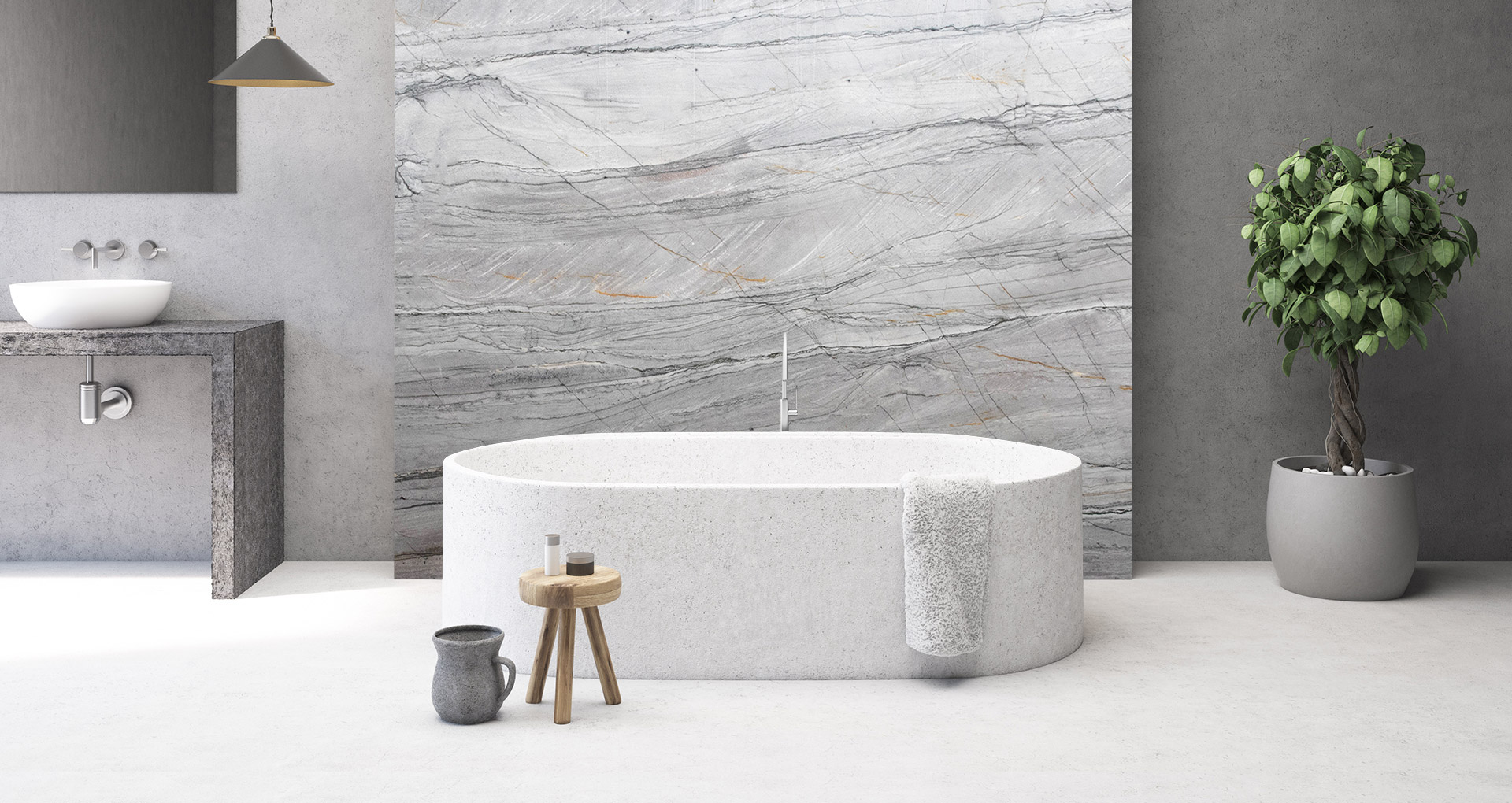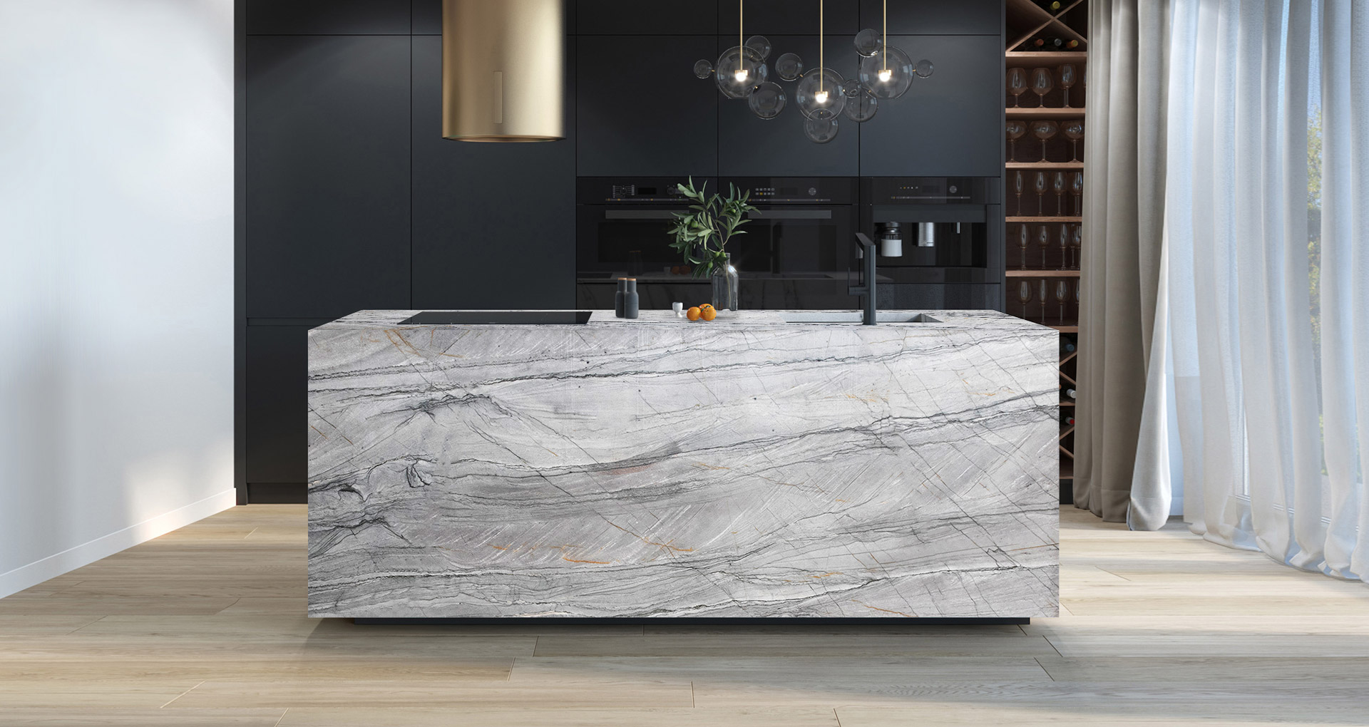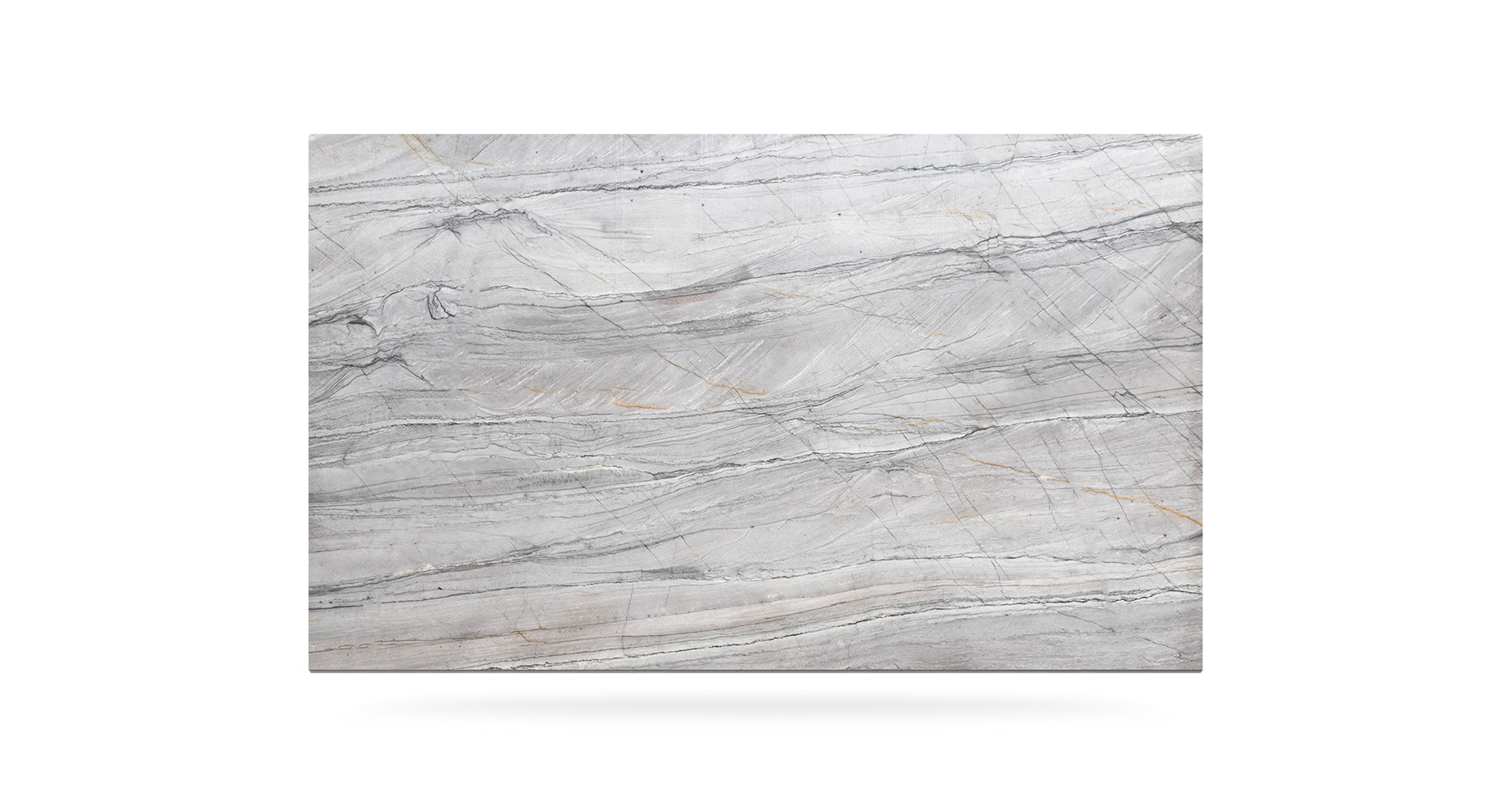 Quartzite from Brazil, where gray is the predominant color. Its various white shades and darker subtle veins cross the slabs, guaranteeing uniqueness to each creation. The hardness and resistance of this material is suitable for use in both internal and external environments, as quartzite is a metamorphic rock resistant to abrasion, acids and temperature changes.