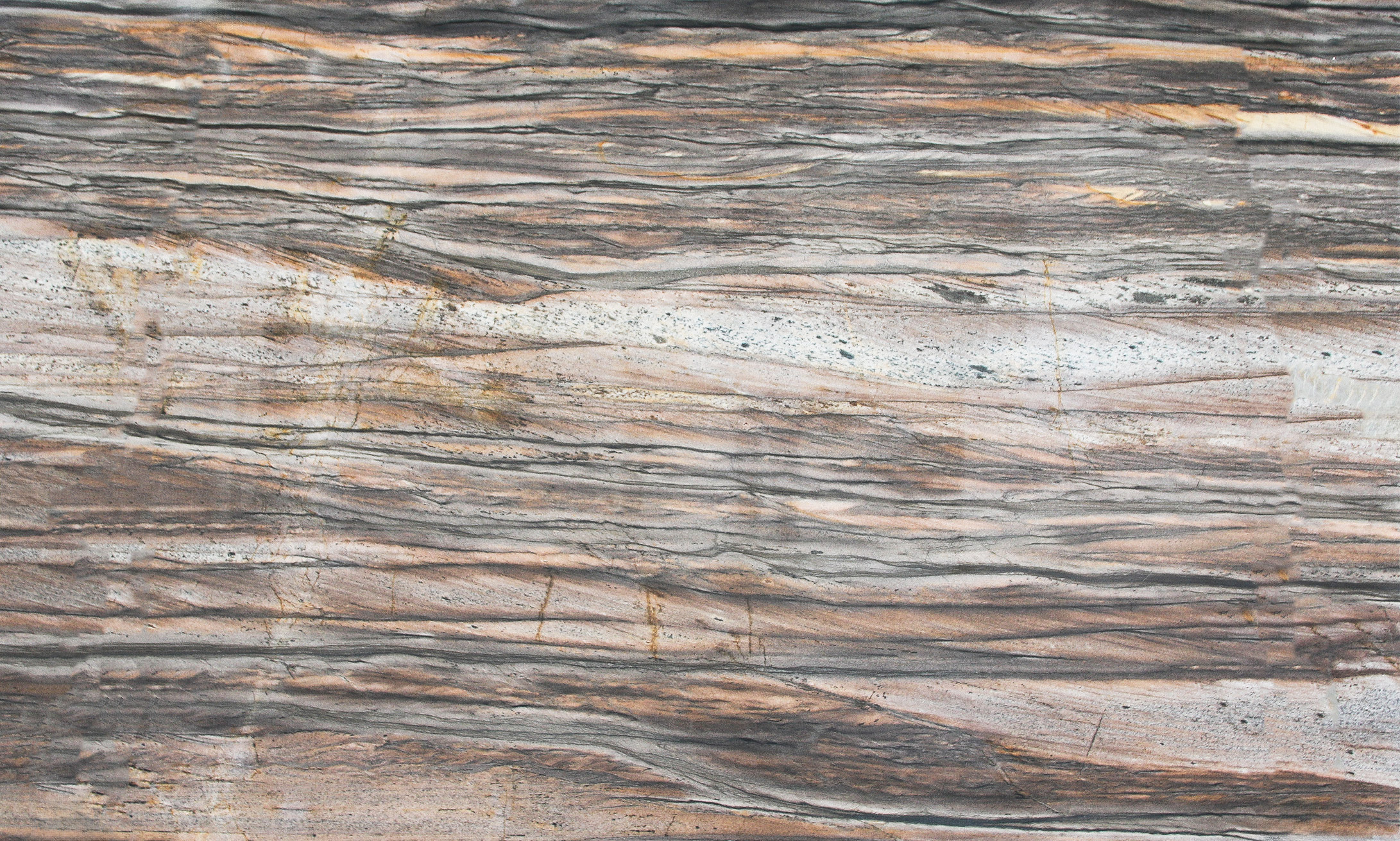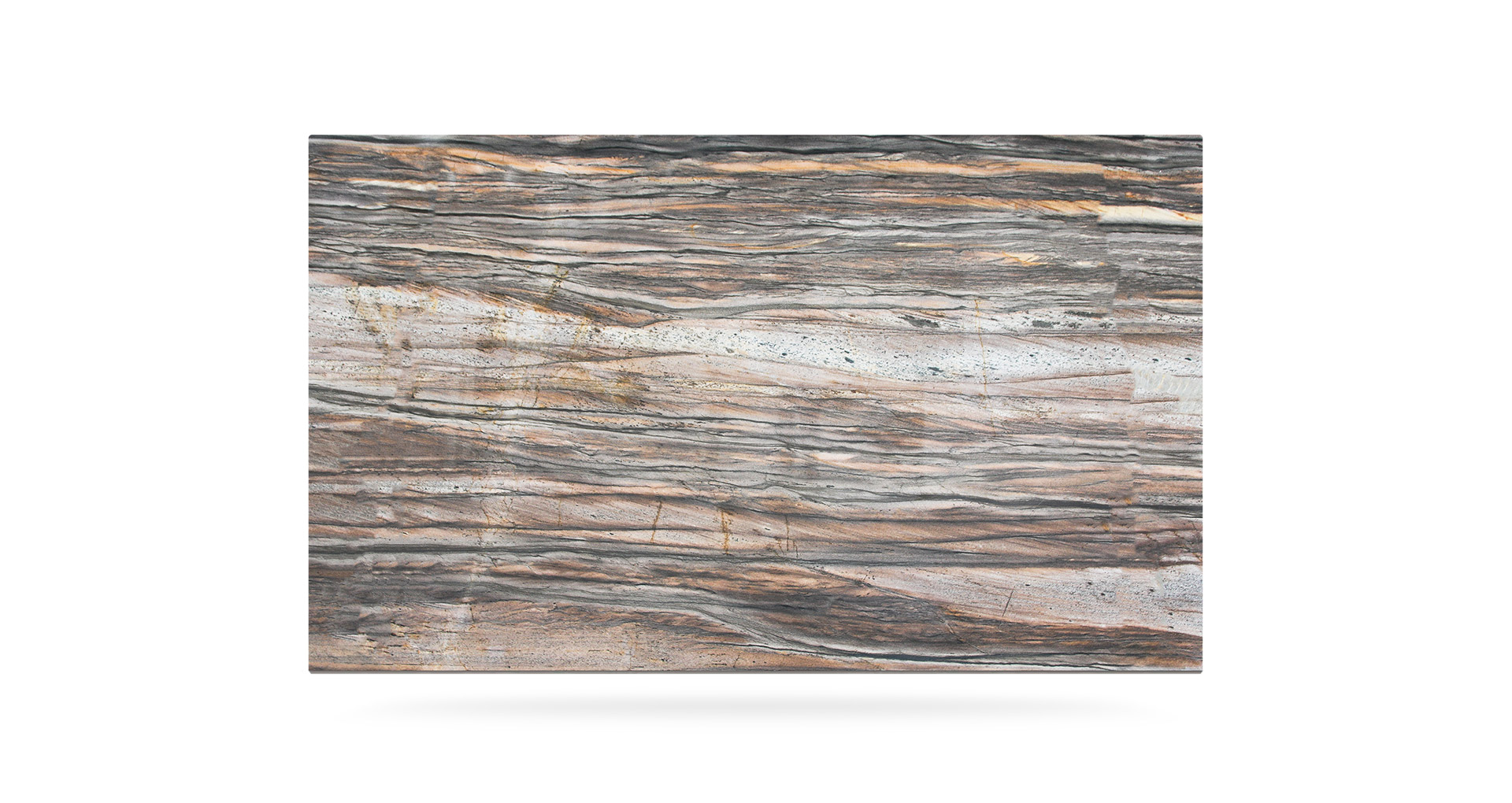Exotic brazilian quartzite. Characterized by a light grey background with colour shades of dark grey, white and brown enriched by fine black veining. Unique in its kind, this particular texture makes it ideal to decorate with style any type of environment.