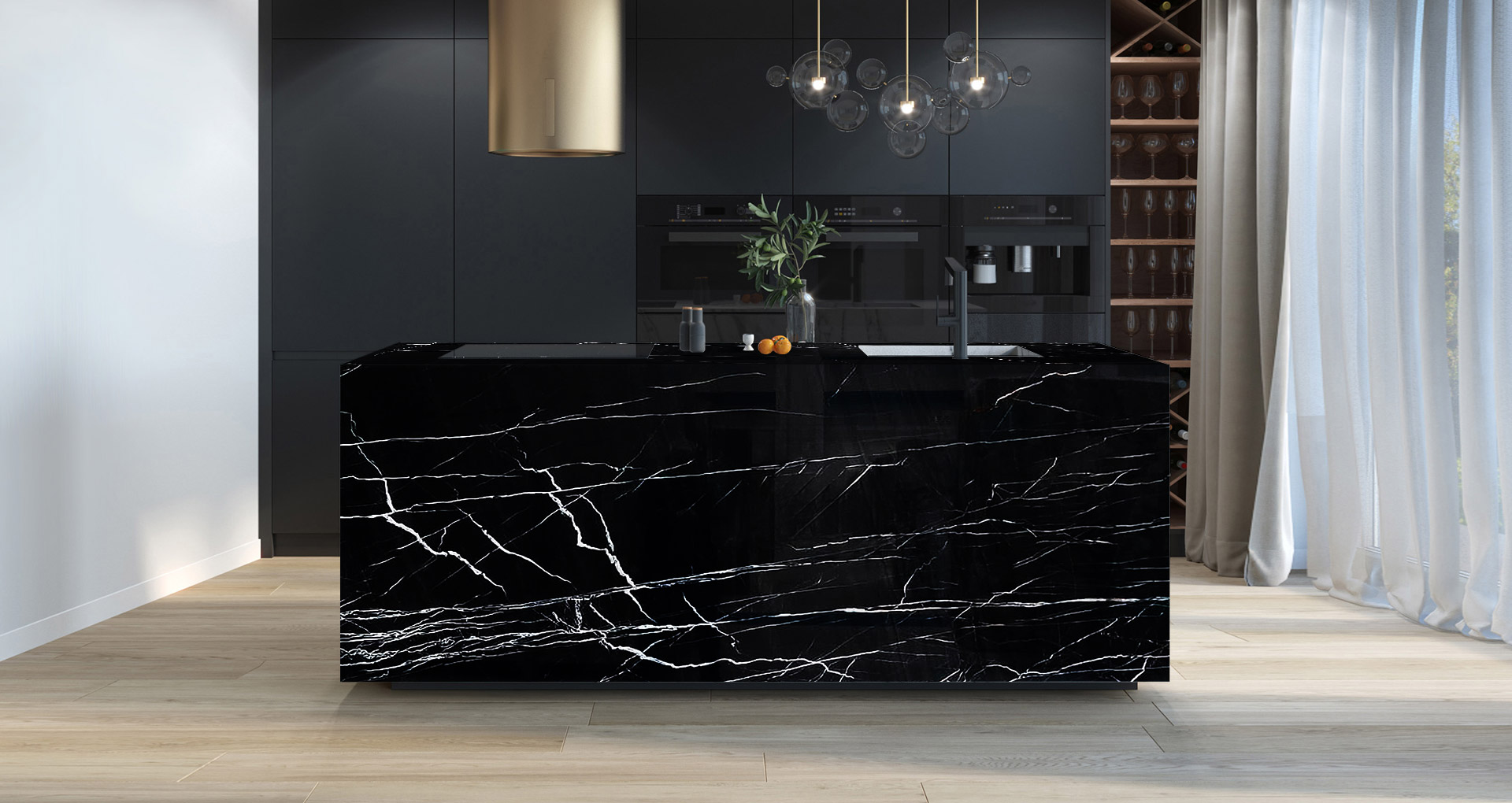 Brazilian quartzite in black with light white veins that cross the slabs in elegant irregular ramifications. This contrast of colors gives the material infinite depth and refinement, characteristics appreciated in the construction field that added to the compactness of quartzite give life to a natural stone ideal for the creation of floors and coverings, but also furnishing accessories, kitchen tops and stairs.