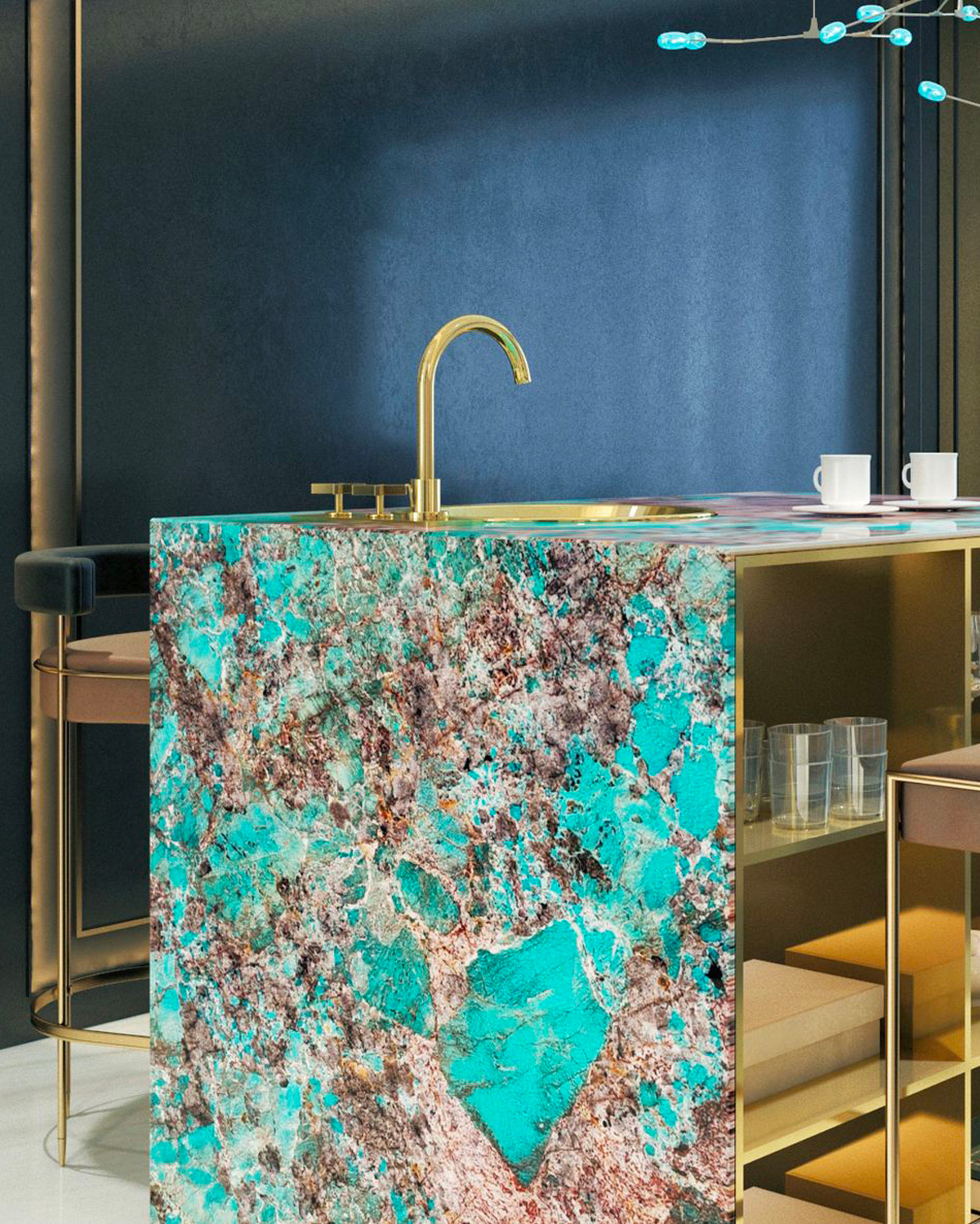 From an aesthetic point of view, Amazonite stands out for its green tones, often compared to the colours of rainforests or the crystal-clear waters of the Amazon. It is a natural stone used for both interior cladding and exclusive furniture elements such as tables, counter-tops and design accessories. Its resistance makes it ideal for flooring and large surfaces with a high visual impact.