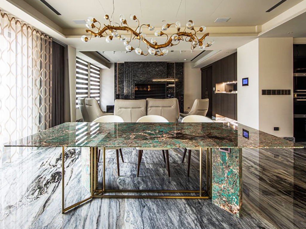 Amazonite is a Brazilian quartzite composed of a mainly turquoise texture, and embellished with scattered shades and veins of green, dove gray and white. Of medium hardness, it is a material used mainly as floors or coverings in internal constructions. It is recommended in a glossy finish.