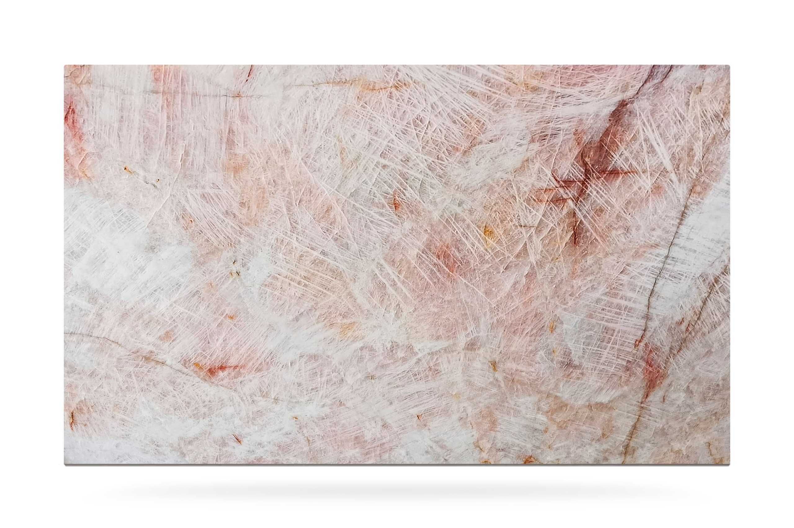 Pink Cristallo Quartzite is one of the most precious varieties among the spectacular quartzites extracted in Brazil. It is a quartzite with a soft pink background, crossed by ivory, lilac, and copper veins, with a “cloudy” structure and slightly translucent areas. Its composition, almost entirely quartz, makes it highly resistant to compression, abrasion, chemicals, and thermal shock, excellent characteristics for surfaces such as kitchen countertops and high-traffic flooring. Thanks to its incredible translucency, it can be backlit for dramatic effects, decorative walls, or architectural details.
