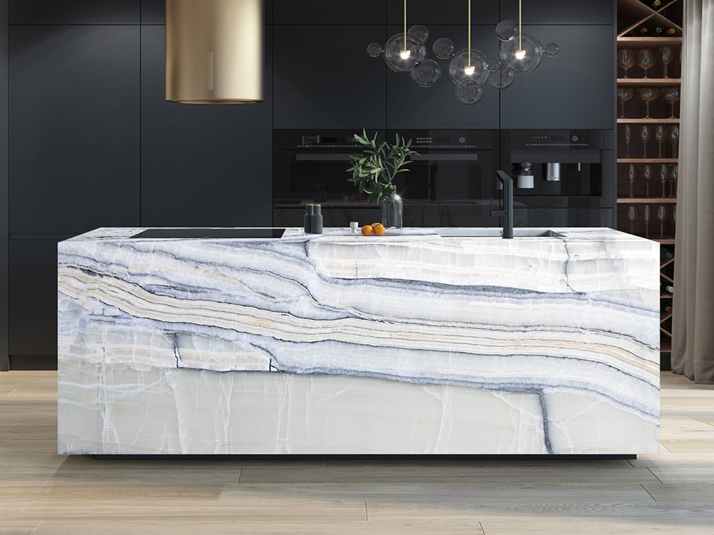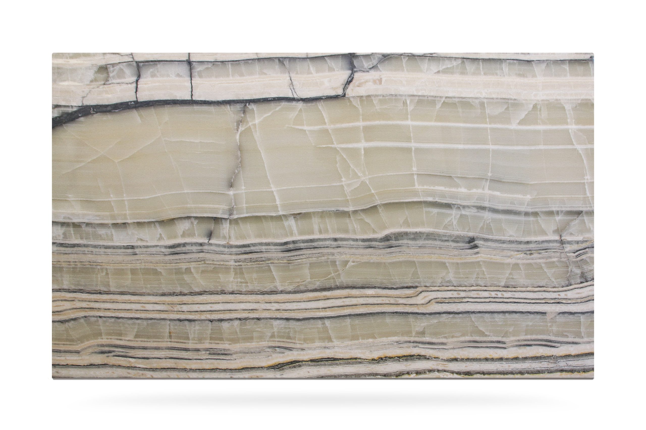 Precious onyx from Iran with soft colors: the light green combines harmoniously with the black, white and sometimes yellowish veins that cross the slabs horizontally. Particularly crystalline, thanks to its wide chromatic variety and its compactness it is used by specialists in the sector to furnish interior design environments with refined elegance.