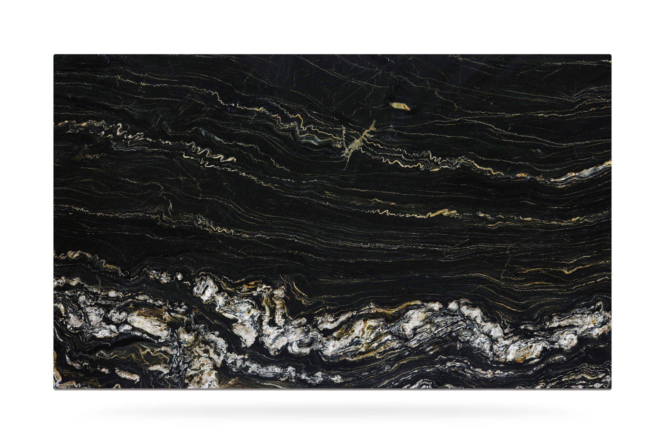 Tropical Storm quartzite is a natural stone of extraordinary beauty, characterized by a dynamic, irregular white-golden veining that crosses the surface like lightening through a blackness so deep to evoke the sky during a storm. Just one look at this magnificent quartzite is enough to understand the origin of its evocative name. The visual effect is striking, its sharp chromatic contrasts and the geometry of its veins allow the creation of book-match compositions of great visual impact.